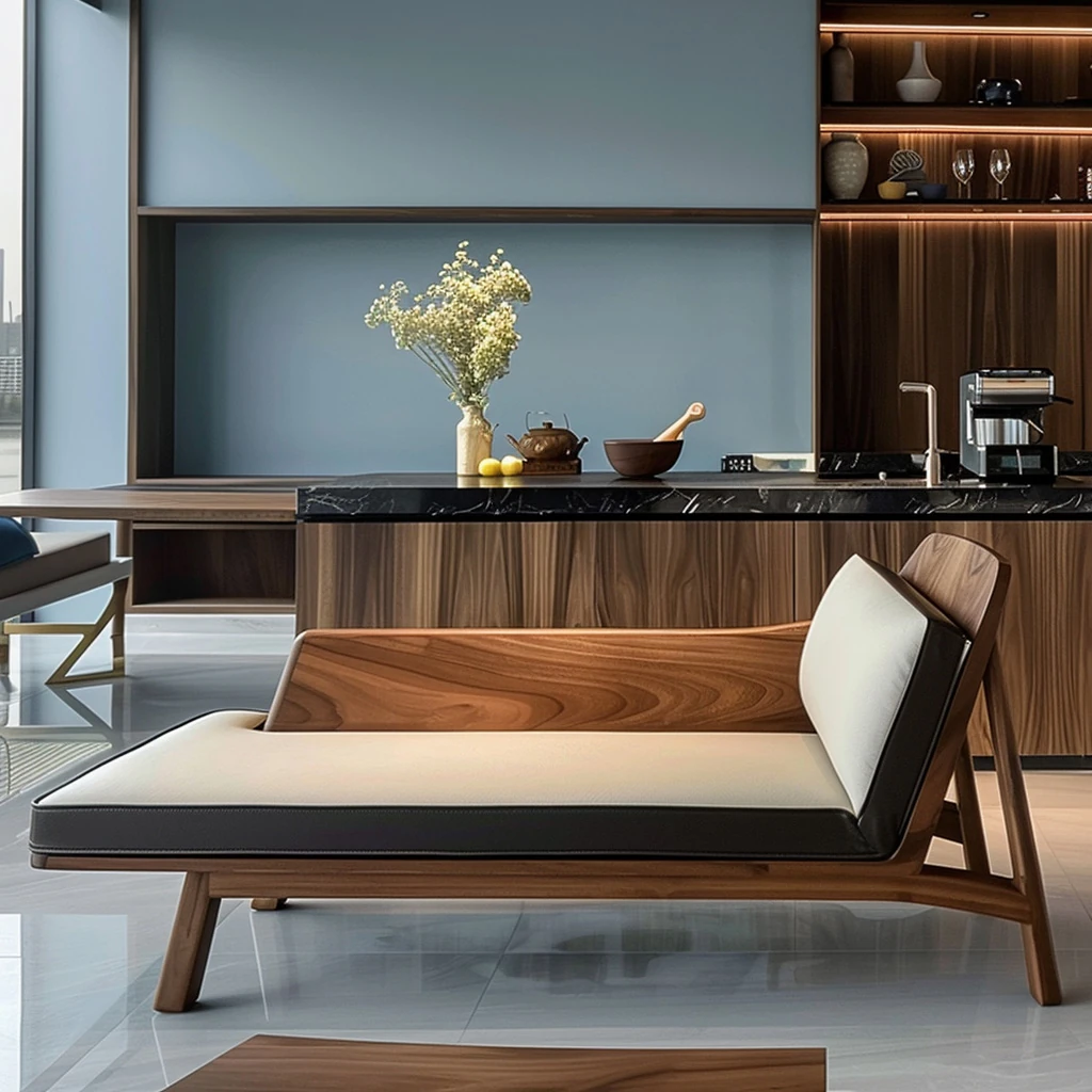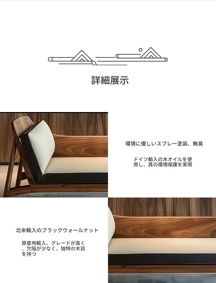 高級感漂う黒胡桃の無垢材製カウチソファ - 新中式の禅の美学を取り入れたモダンでシンプルなデザイン、リビングや寝室にぴったりの贅沢なひとときをあなたに。