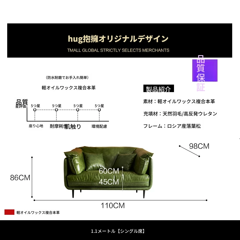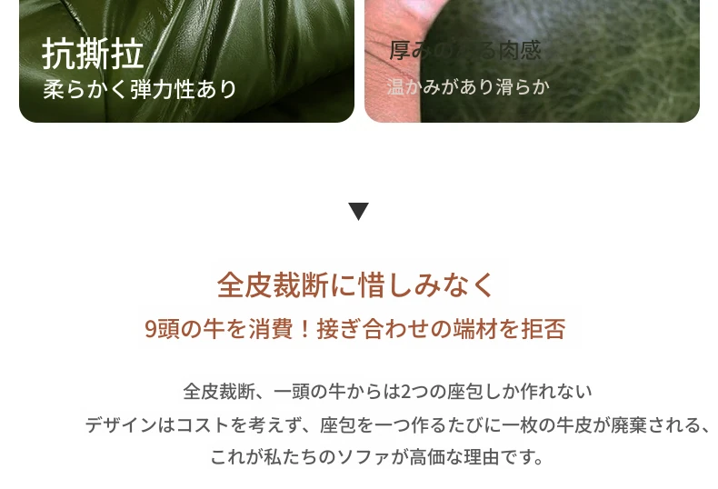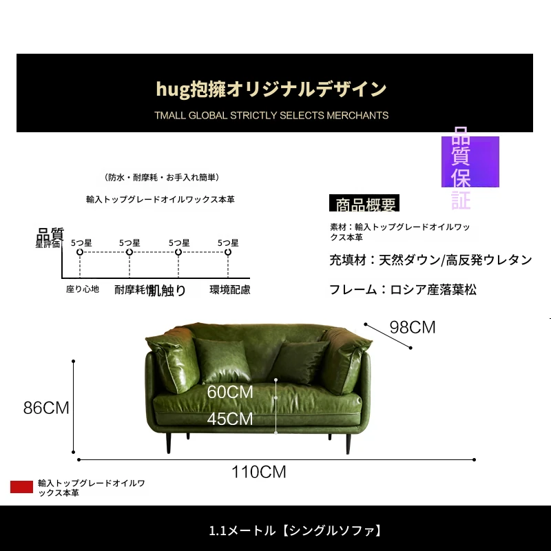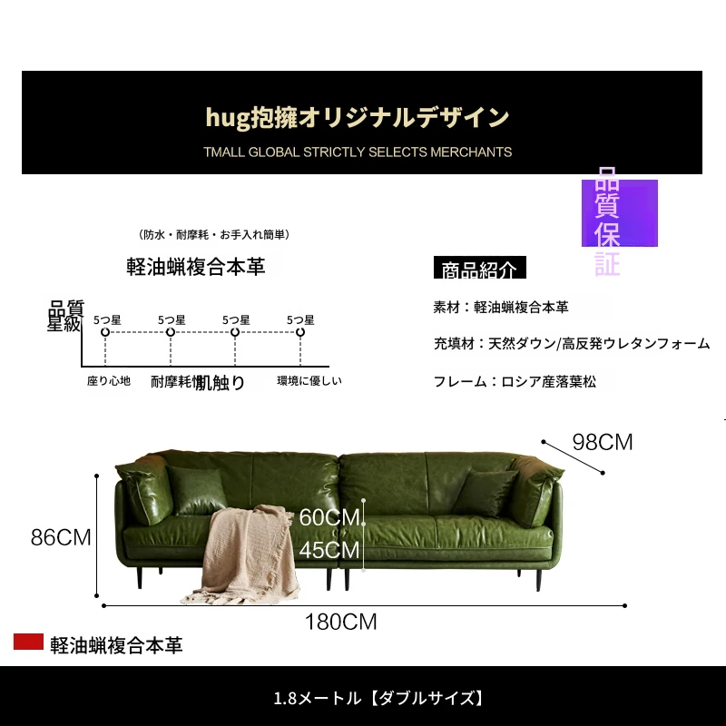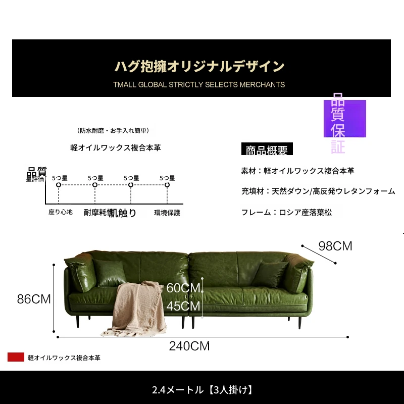 2.2メートル小型3人用【輸入油蜡一層本革】