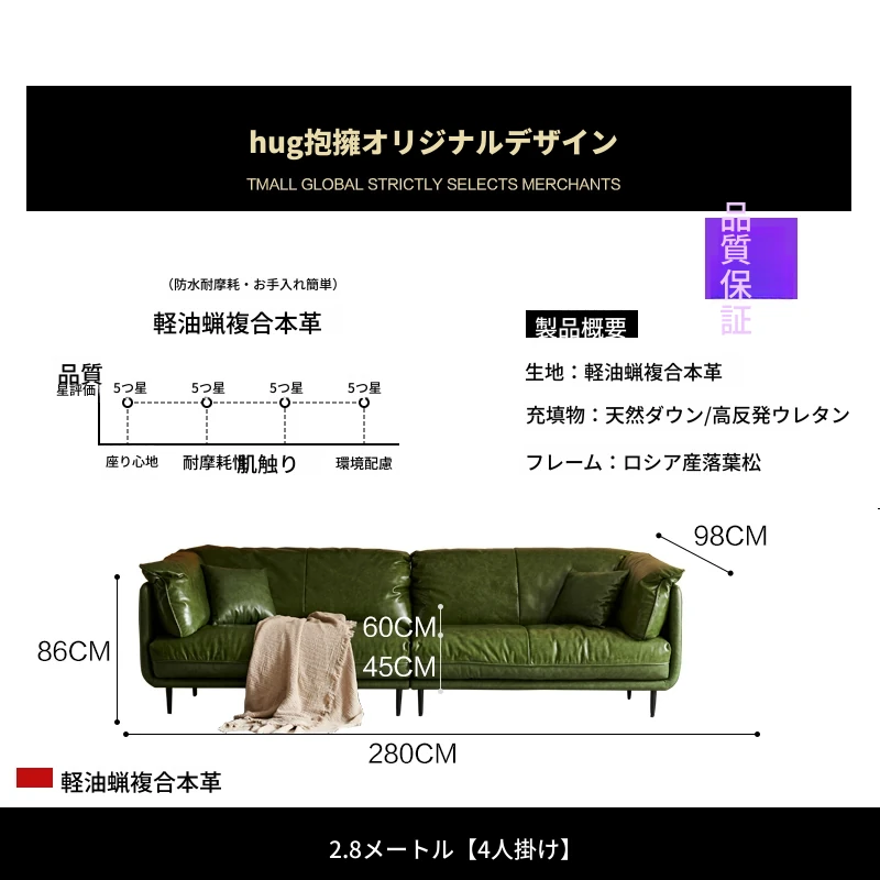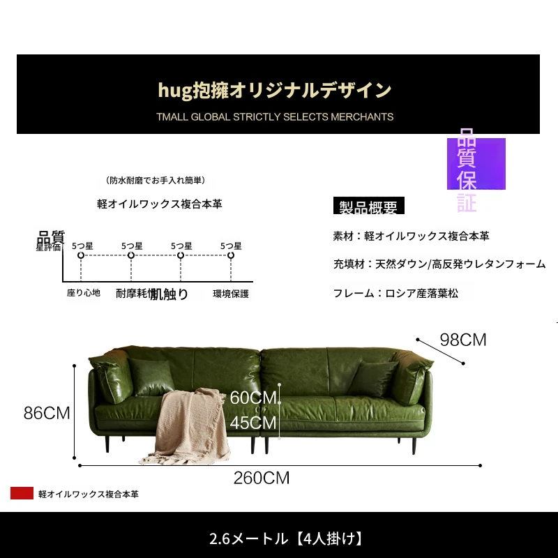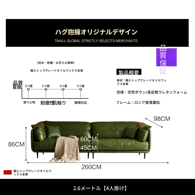 2.6メートル小型4人用【輸入油蜡一層本革】