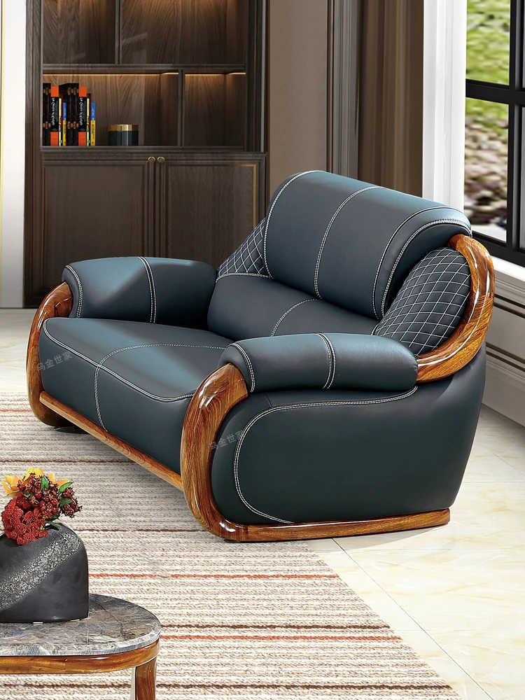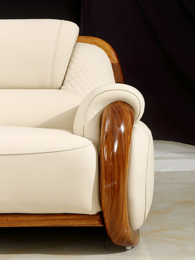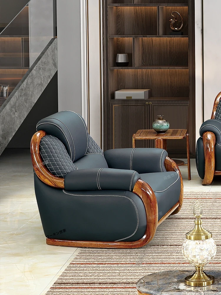 新中式ウッドウィングレザーソファ - 高級感あふれる広東・佛山製、ラグジュアリーなリビングにぴったり!2025年新作、軽やかな贅沢をお届けします。