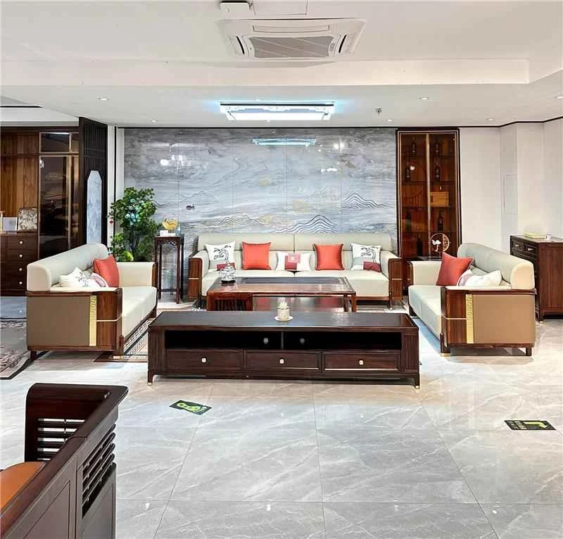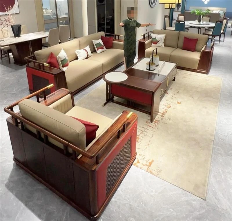 高級新中式ソファー ウーキン材の無垢材使用!リビングにぴったりな広々としたデザインで、別荘や豪邸、クラブハウスにも最適。モダンでシンプルなスタイルが魅力の大空間向けソファーです。