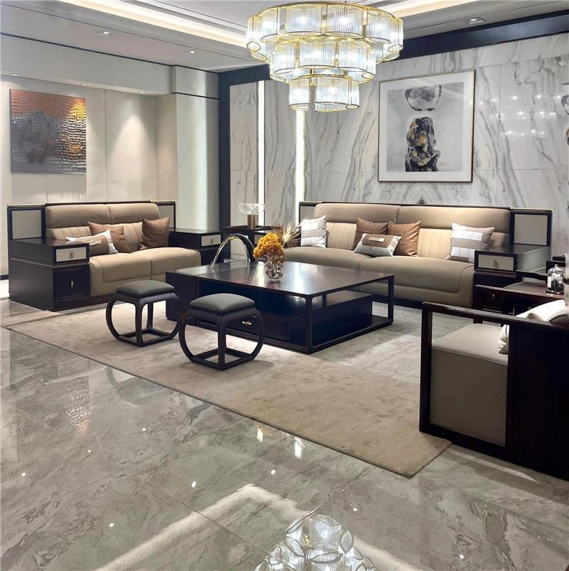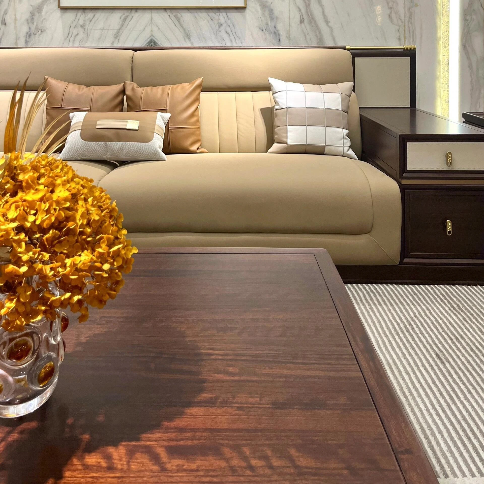 高級新中式ソファー ウーキン材の無垢材使用!リビングにぴったりな広々としたデザインで、別荘や豪邸、クラブハウスにも最適。モダンでシンプルなスタイルが魅力の大空間向けソファーです。