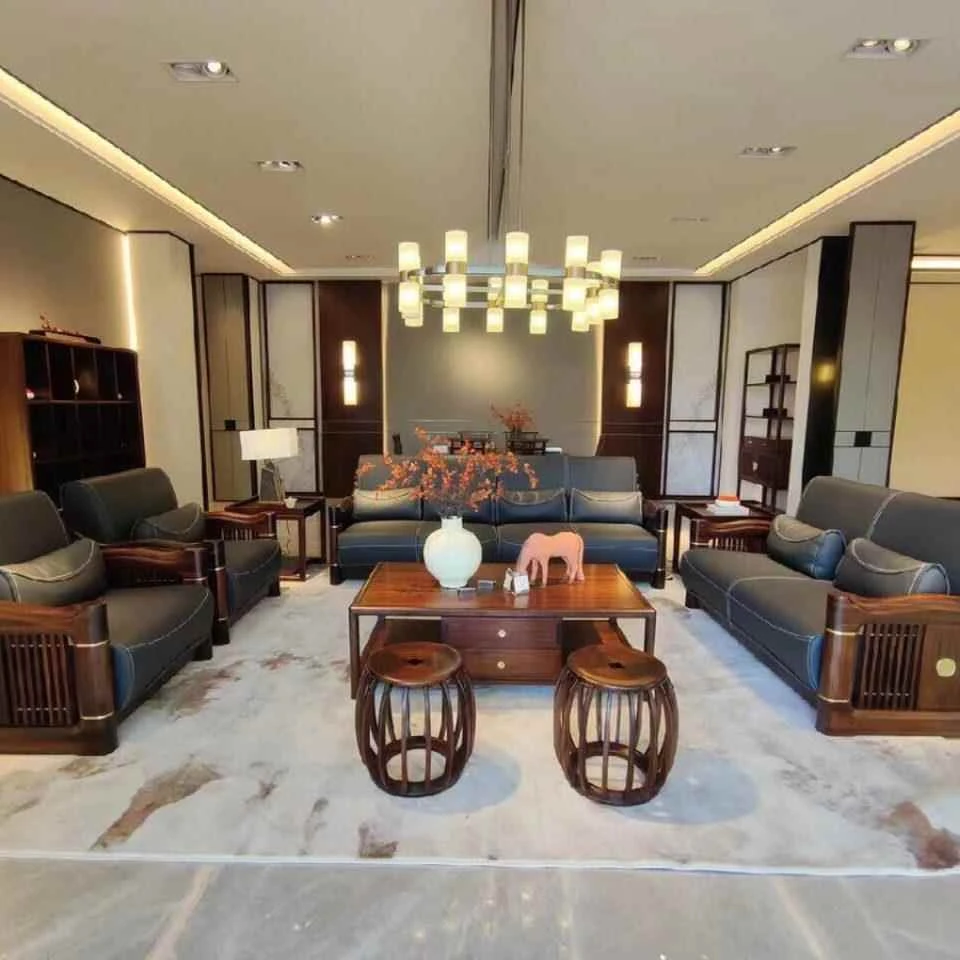 高級新中式ソファー ウーキン材の無垢材使用!リビングにぴったりな広々としたデザインで、別荘や豪邸、クラブハウスにも最適。モダンでシンプルなスタイルが魅力の大空間向けソファーです。