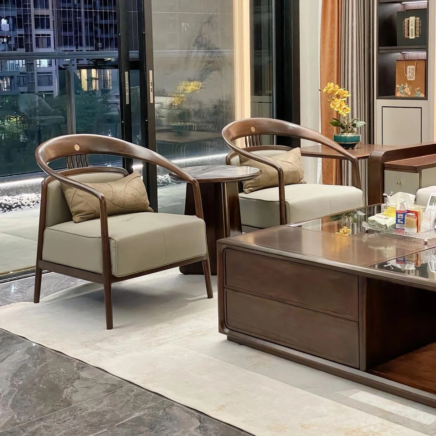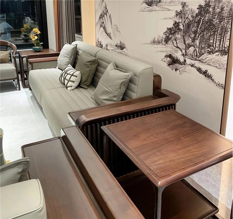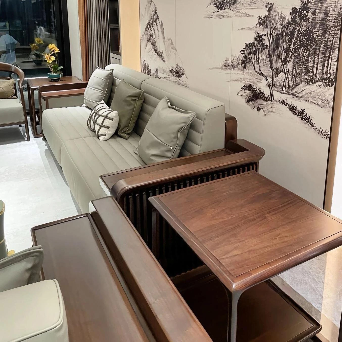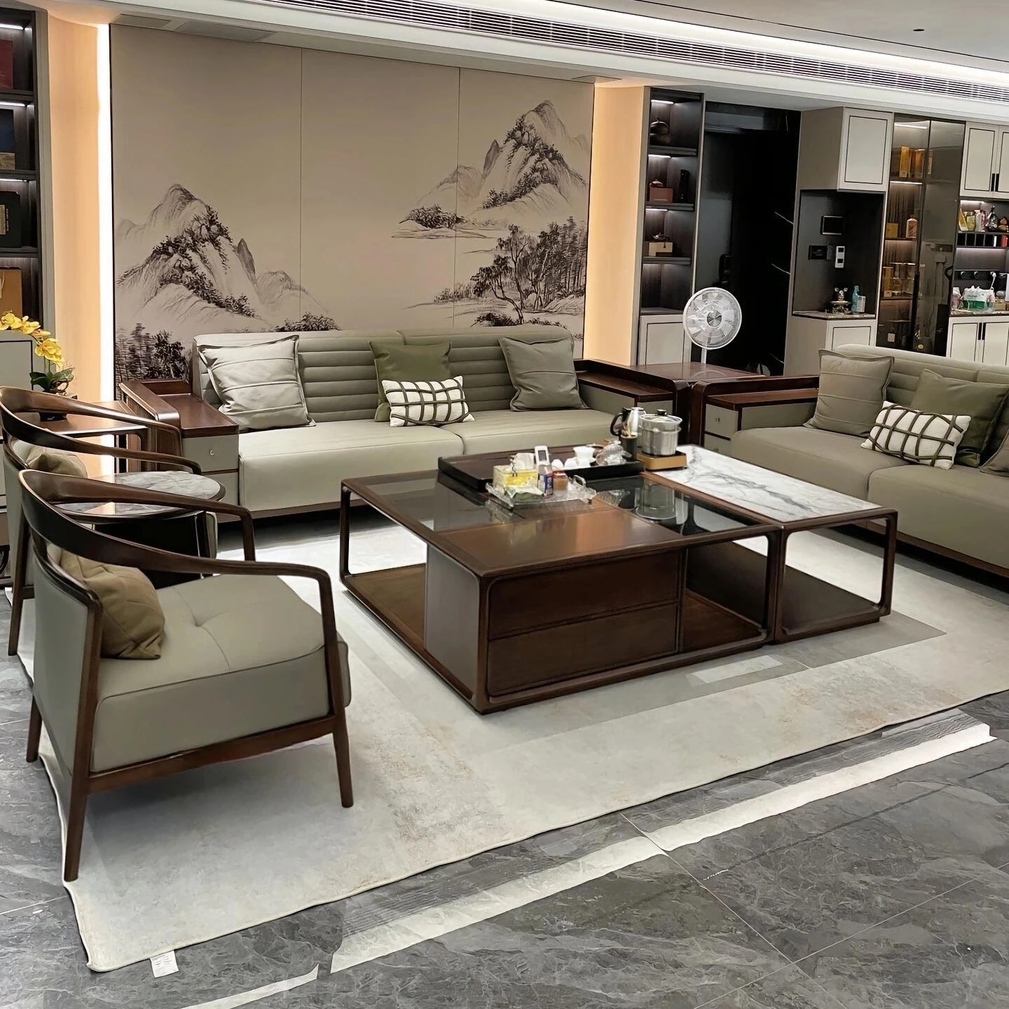 高級新中式ソファー ウーキン材の無垢材使用!リビングにぴったりな広々としたデザインで、別荘や豪邸、クラブハウスにも最適。モダンでシンプルなスタイルが魅力の大空間向けソファーです。