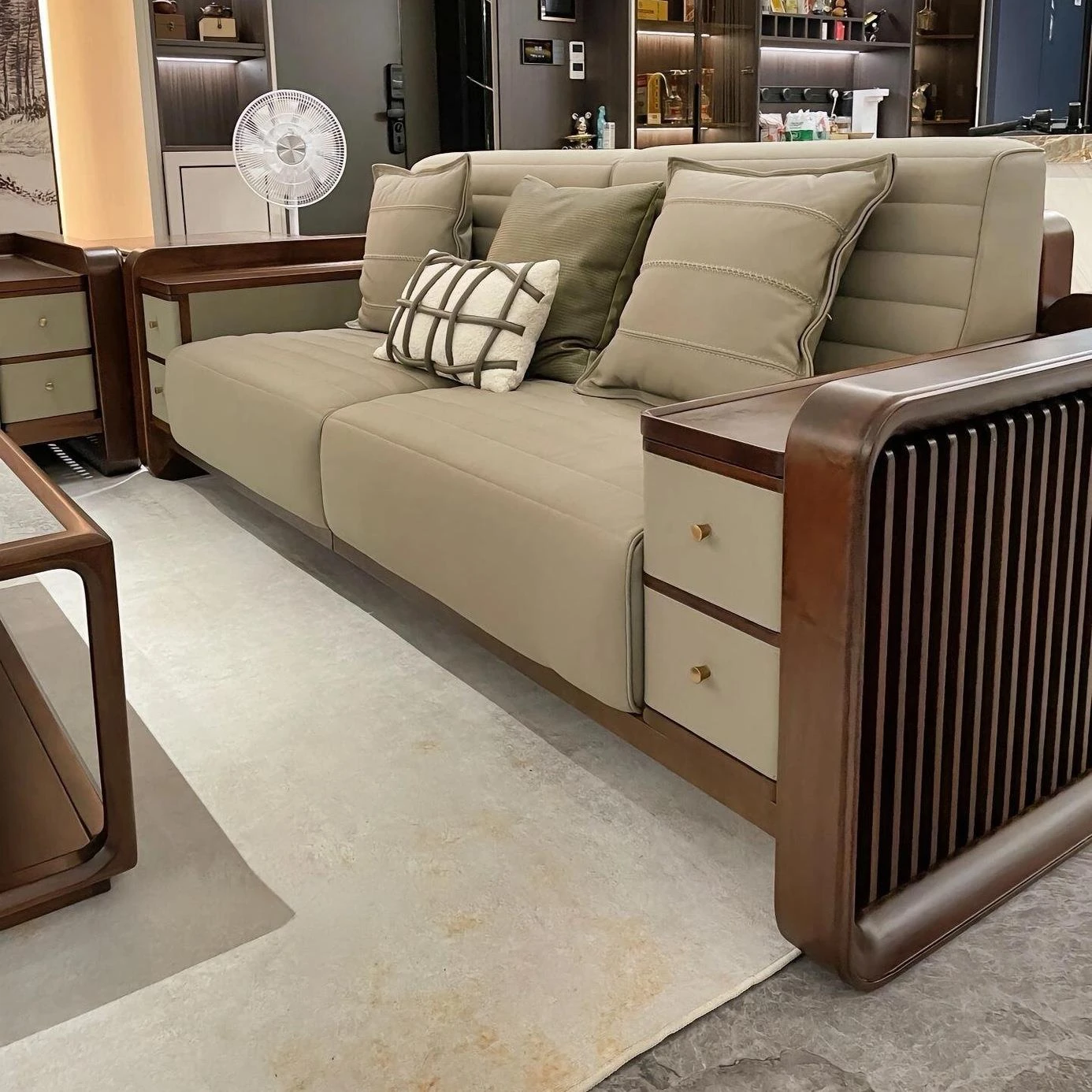 2025年新作!新中式胡桃木実木ソファ - モダンでラグジュアリーなシンプルデザイン、リビングにぴったりのストレートソファ。高品質な実木家具で、心地よいひとときをお届けします。