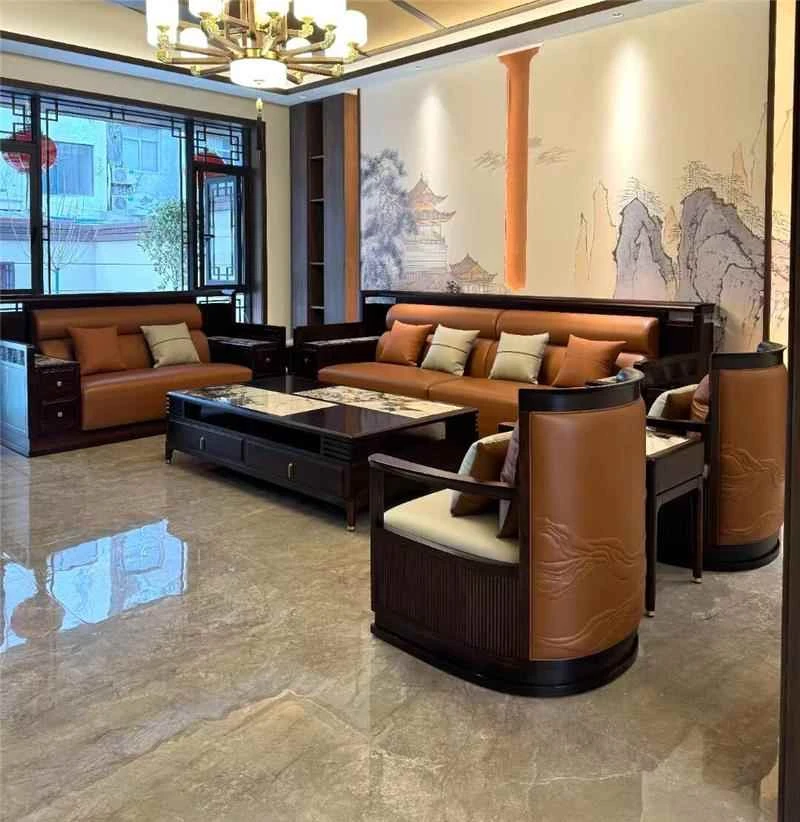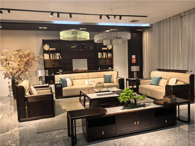 高級新中式ソファー ウーキン材の無垢材使用!リビングにぴったりな広々としたデザインで、別荘や豪邸、クラブハウスにも最適。モダンでシンプルなスタイルが魅力の大空間向けソファーです。