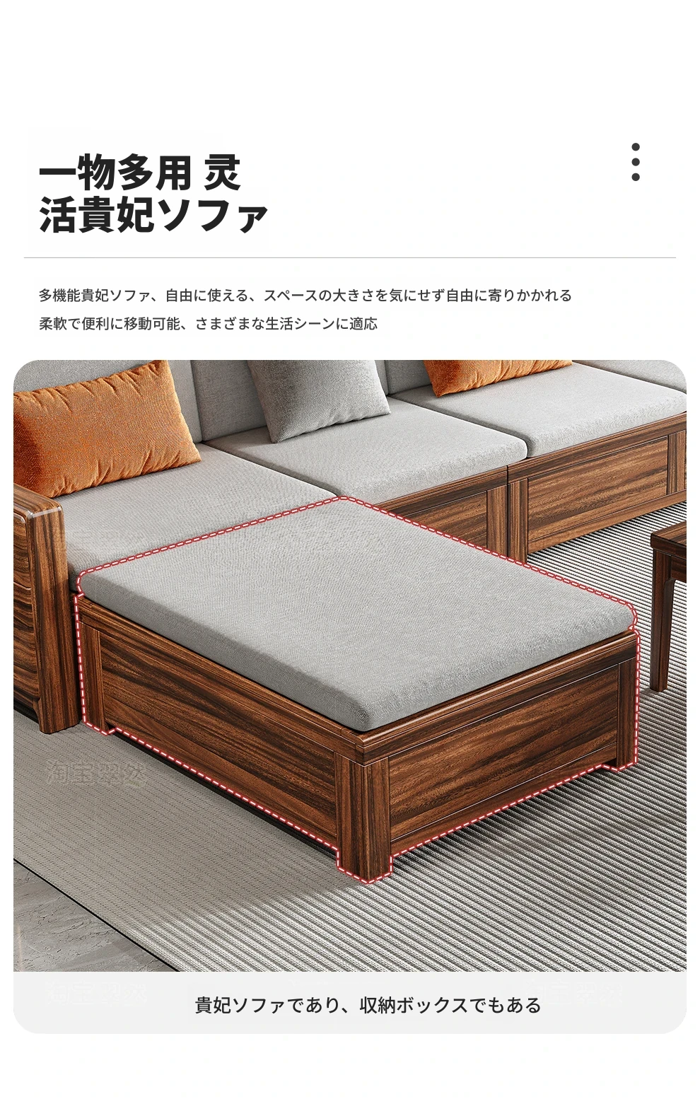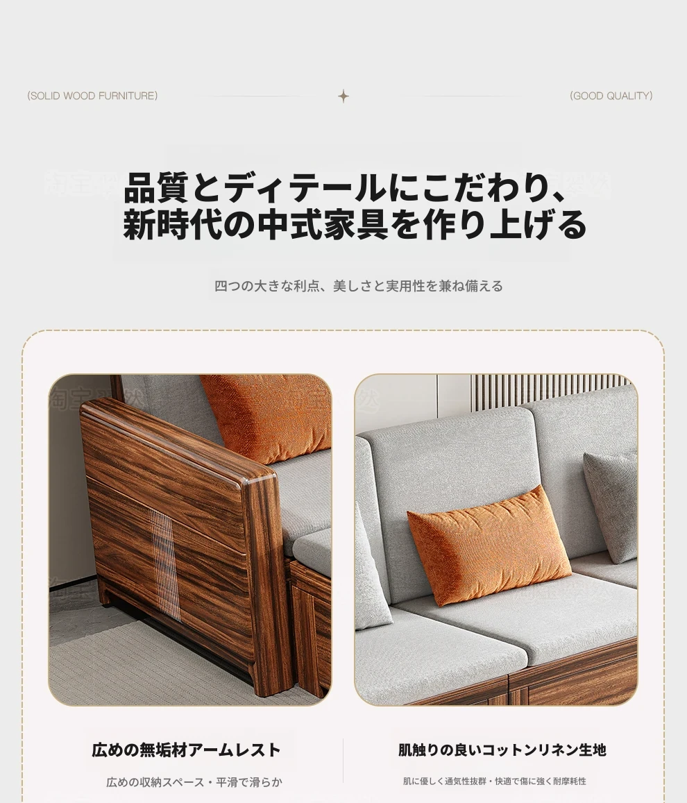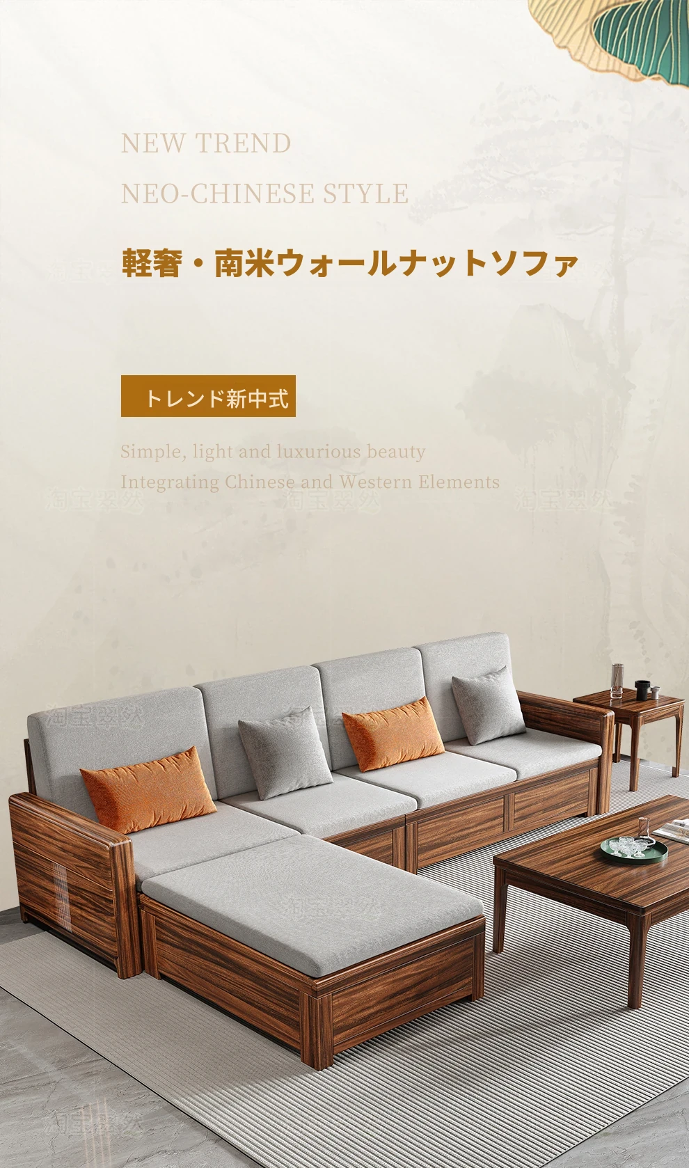 高級南米クルミ無垢材ソファ - リビングに最適な小型デザイン、引き出し付きで便利な収納スペースも!新中式スタイルの上質な家具で快適な空間を演出。