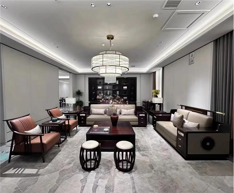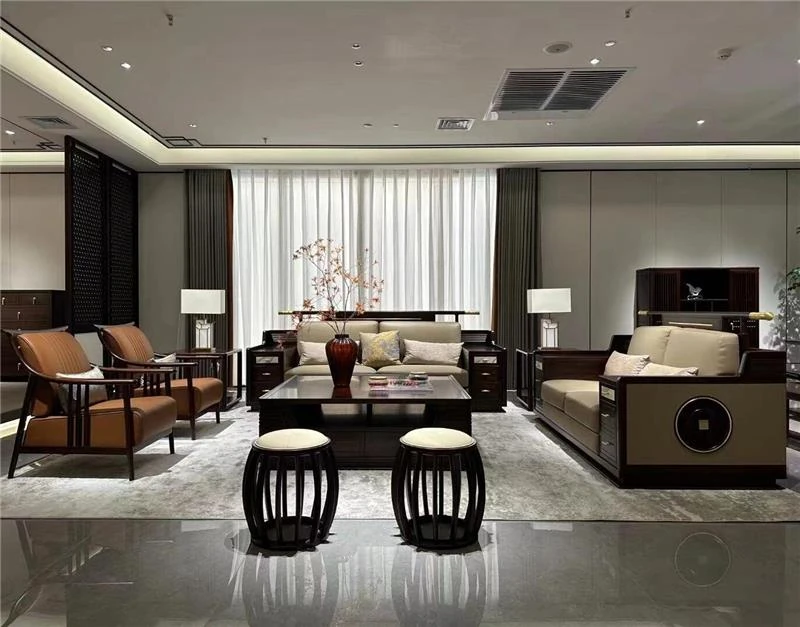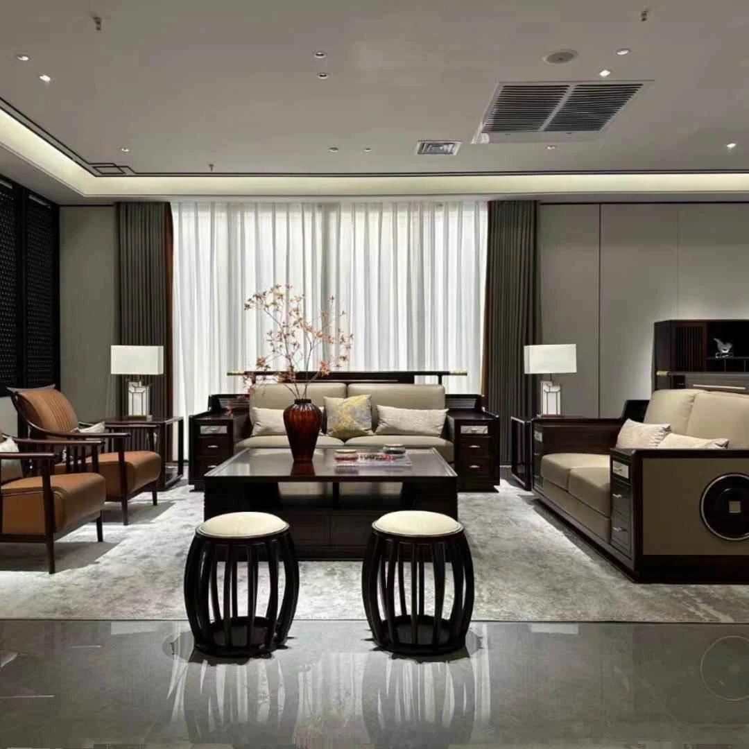 高級新中式ソファー ウーキン材の無垢材使用!リビングにぴったりな広々としたデザインで、別荘や豪邸、クラブハウスにも最適。モダンでシンプルなスタイルが魅力の大空間向けソファーです。