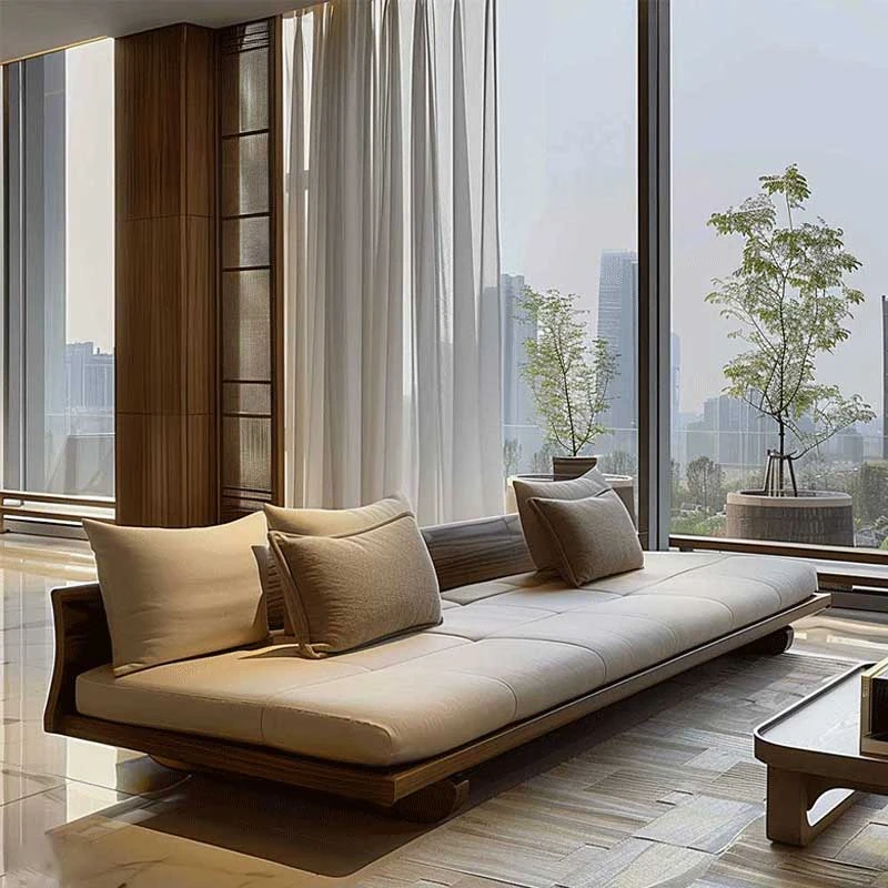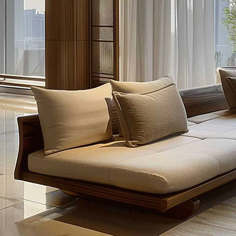 モダンミニマリストのブラックウォールナットソファ - 新しい中式の禅スタイル、実木製の高級真皮、別荘やホテル、民宿に最適な家具!快適さと洗練されたデザインを兼ね備えた一品です。