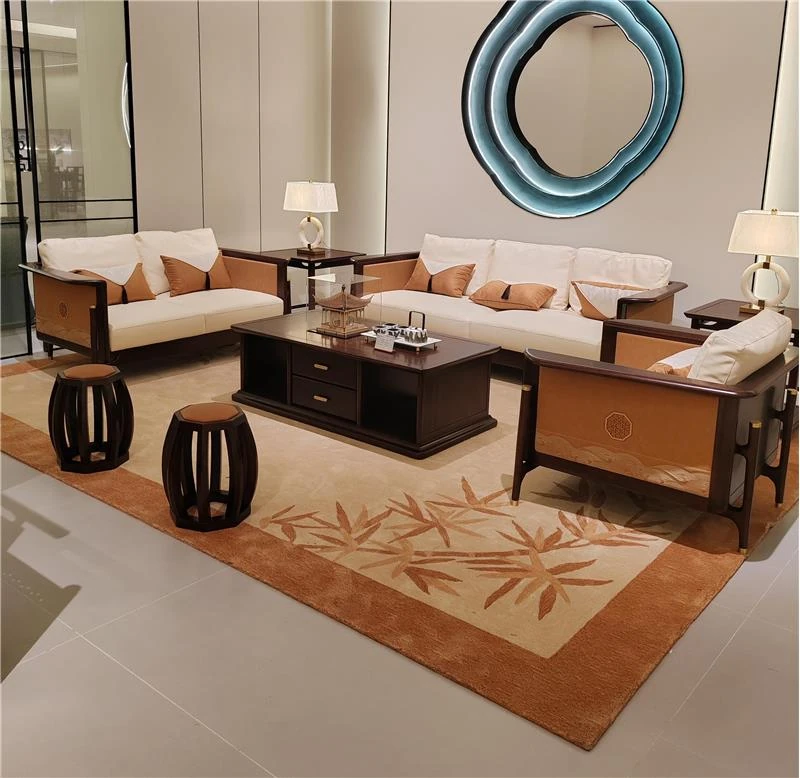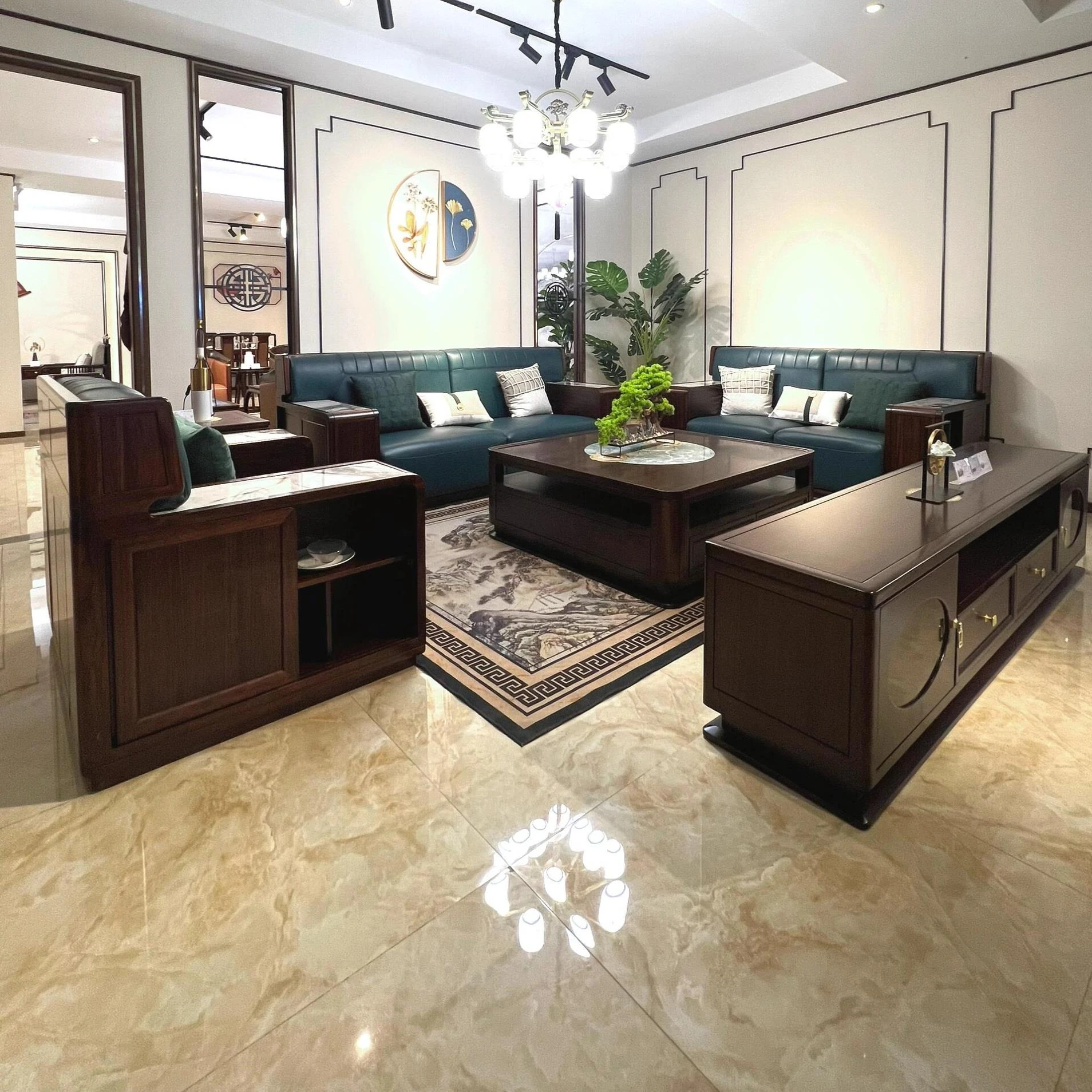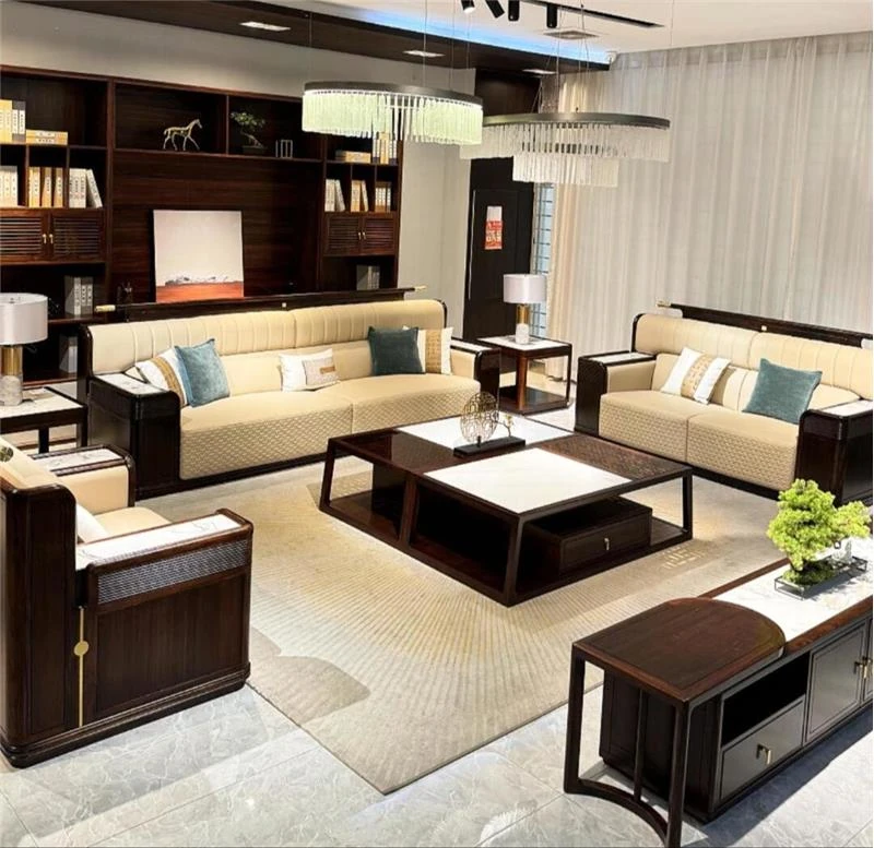 高級新中式ソファー ウーキン材の無垢材使用!リビングにぴったりな広々としたデザインで、別荘や豪邸、クラブハウスにも最適。モダンでシンプルなスタイルが魅力の大空間向けソファーです。