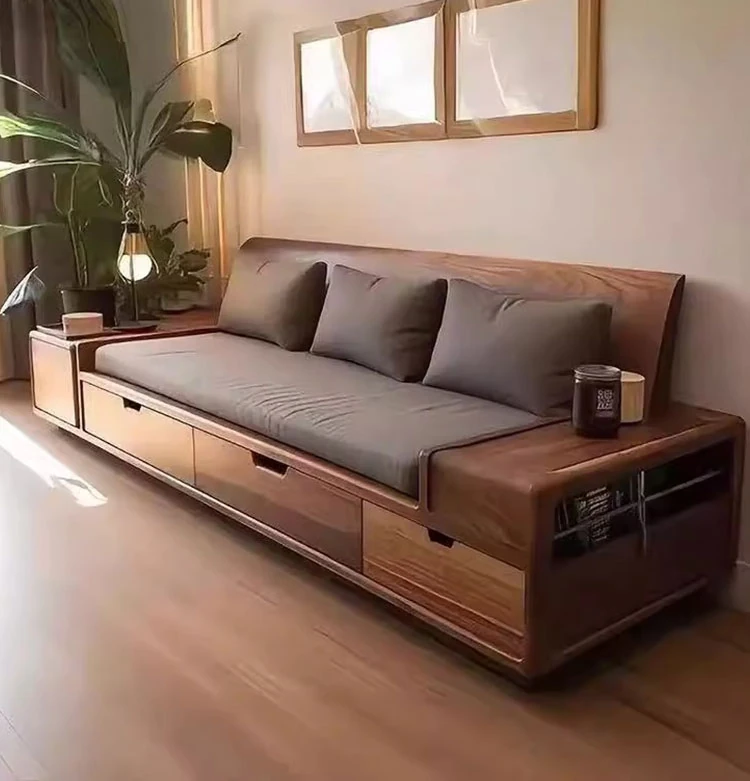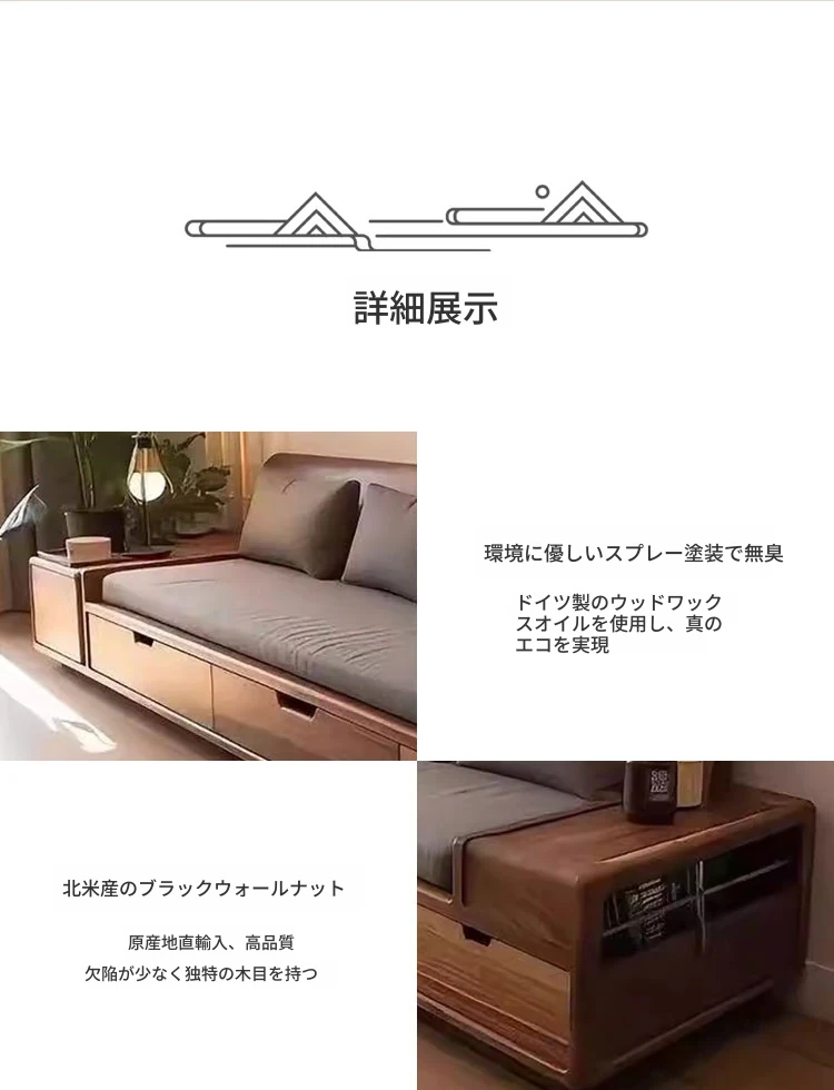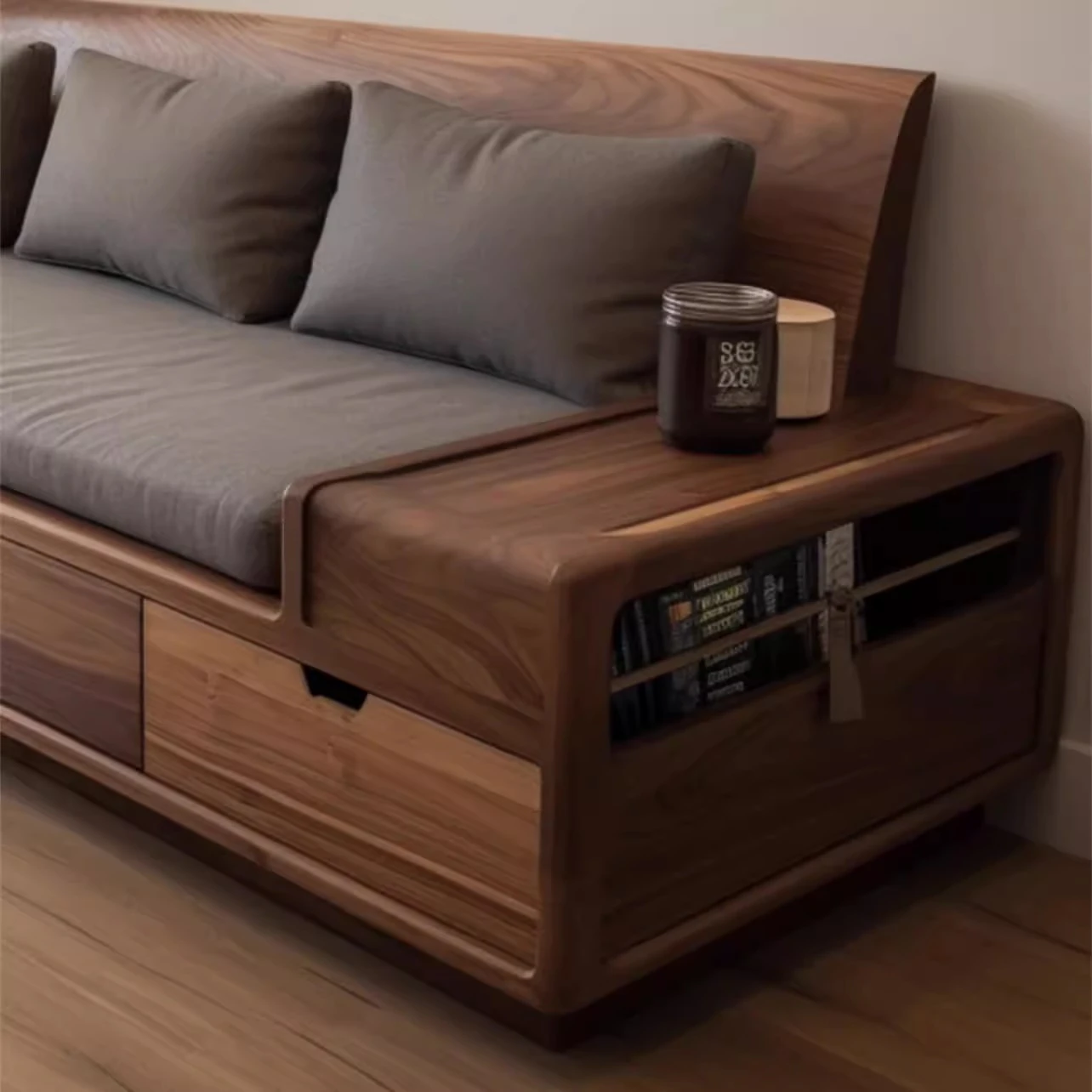 新中式スタイルの無垢材ソファ - モダンでシンプルなデザイン、引き出し付き、冬も夏も快適に使える!高級ブラックウォールナット材使用のリビングルームにぴったりなソファ。
