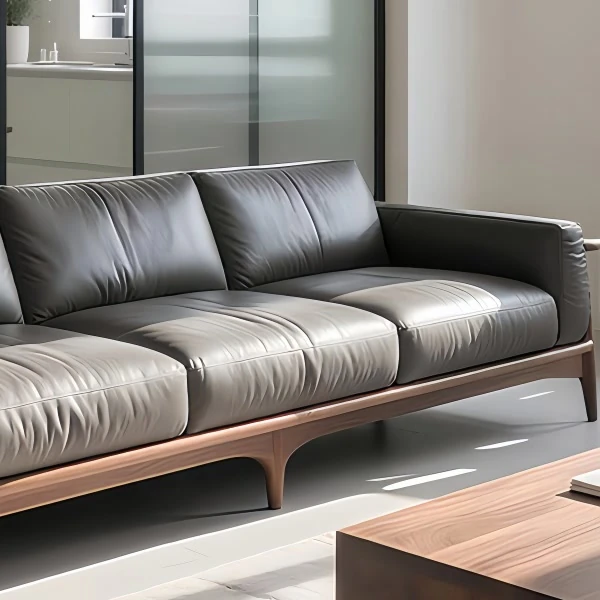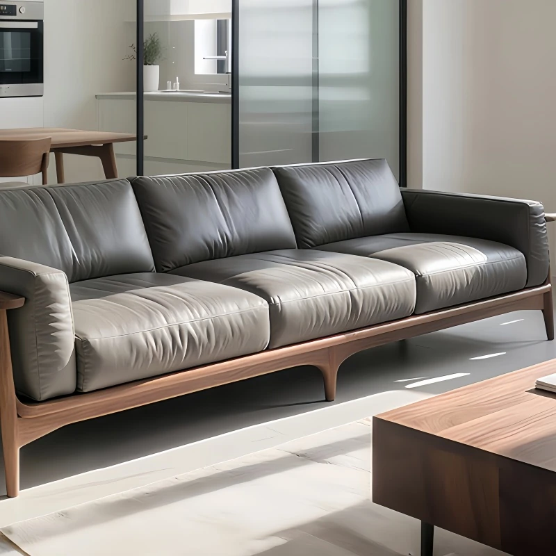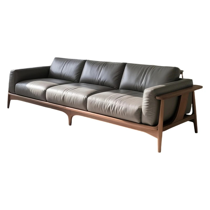 新中式ウォールナット無垢材ソファー、レザー仕上げのラグジュアリーな3人掛け。モダンでシンプル、コンパクトなリビングにぴったりの家具です。あなたの空間に洗練された美しさを加えます!