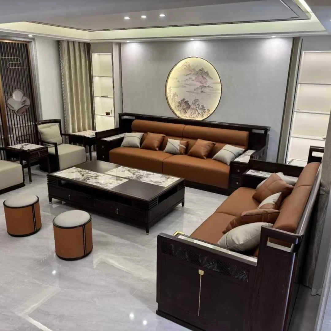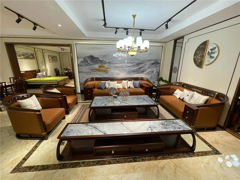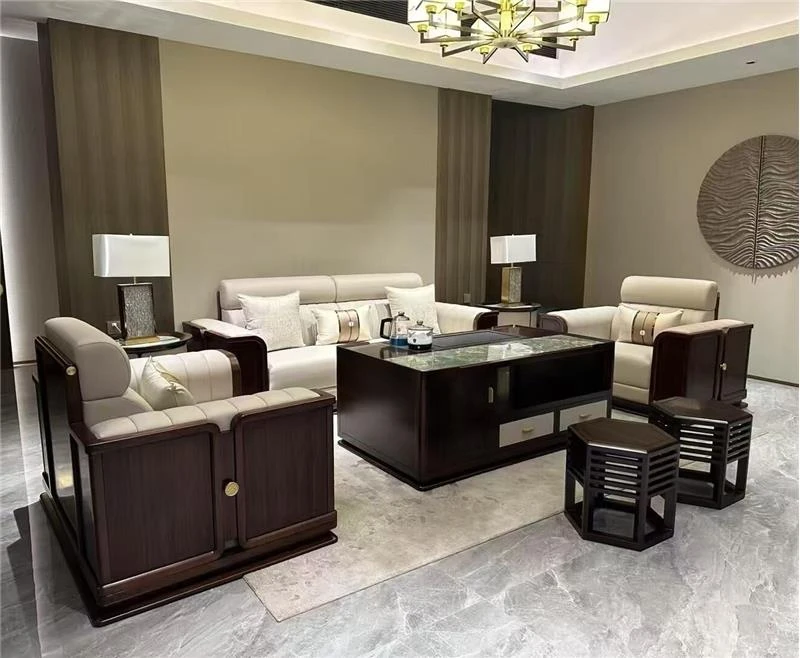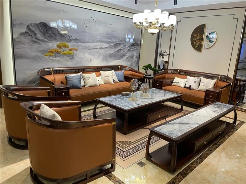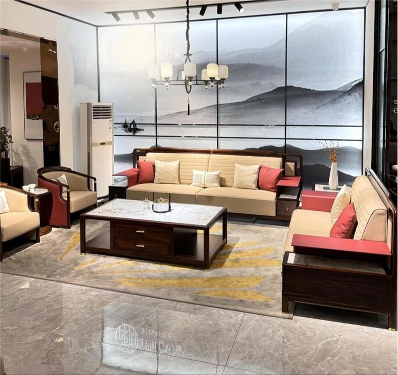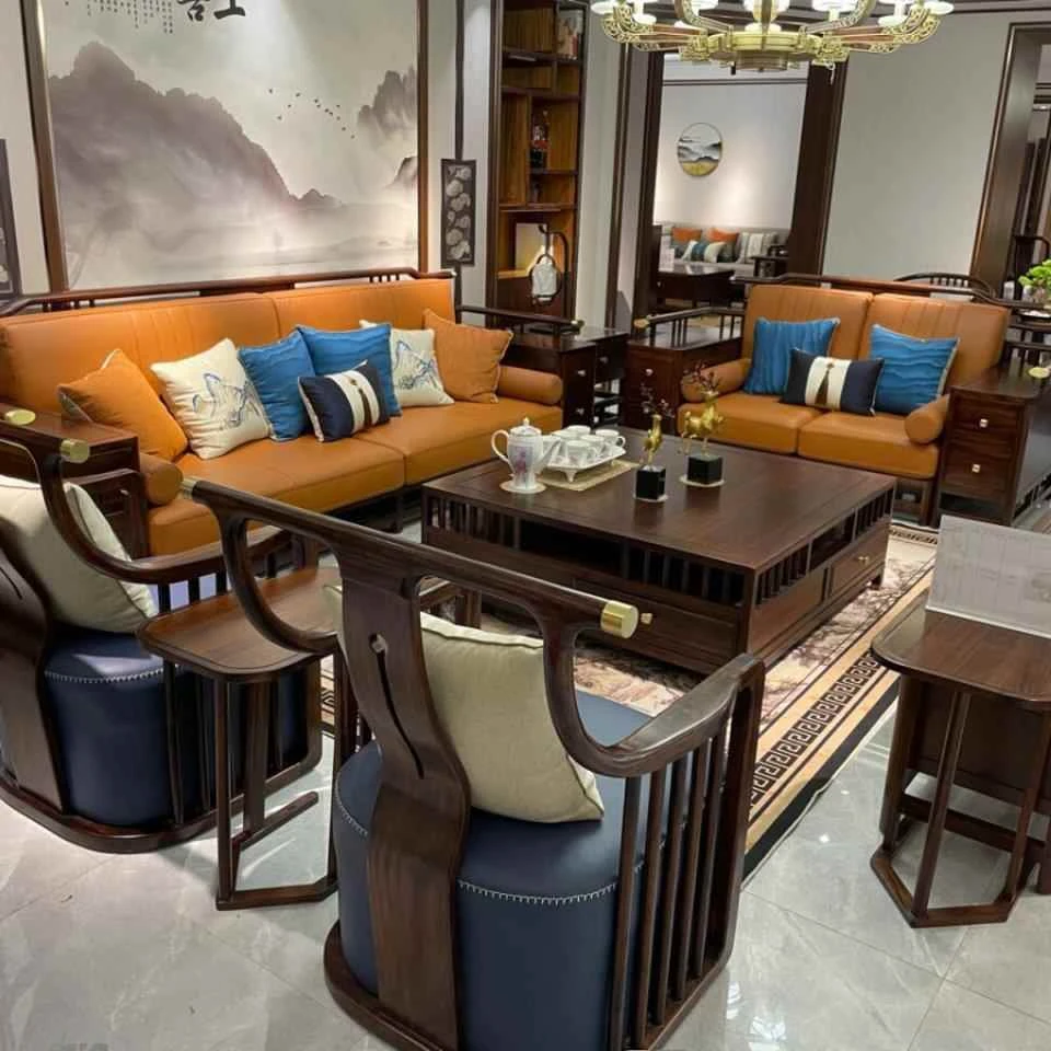 高級新中式ソファー ウーキン材の無垢材使用!リビングにぴったりな広々としたデザインで、別荘や豪邸、クラブハウスにも最適。モダンでシンプルなスタイルが魅力の大空間向けソファーです。