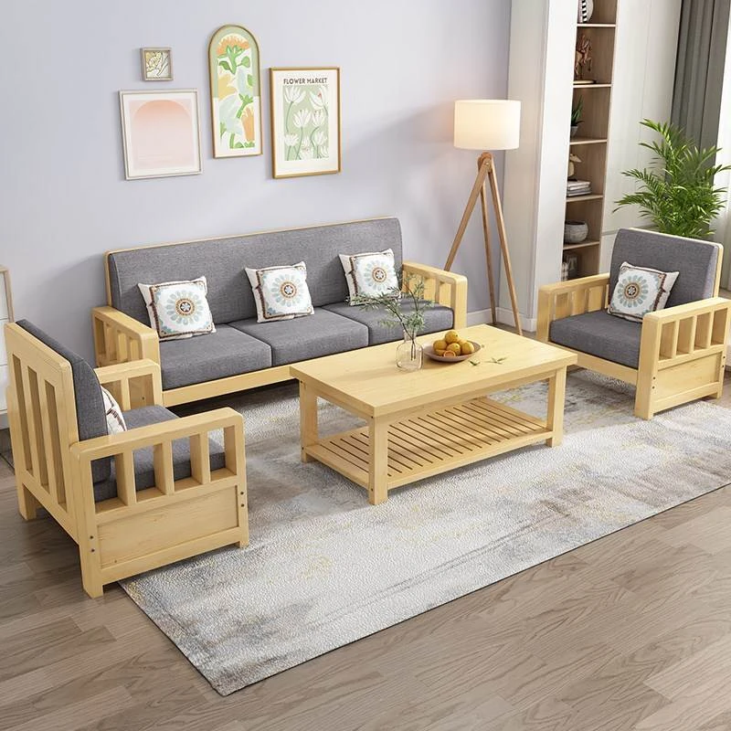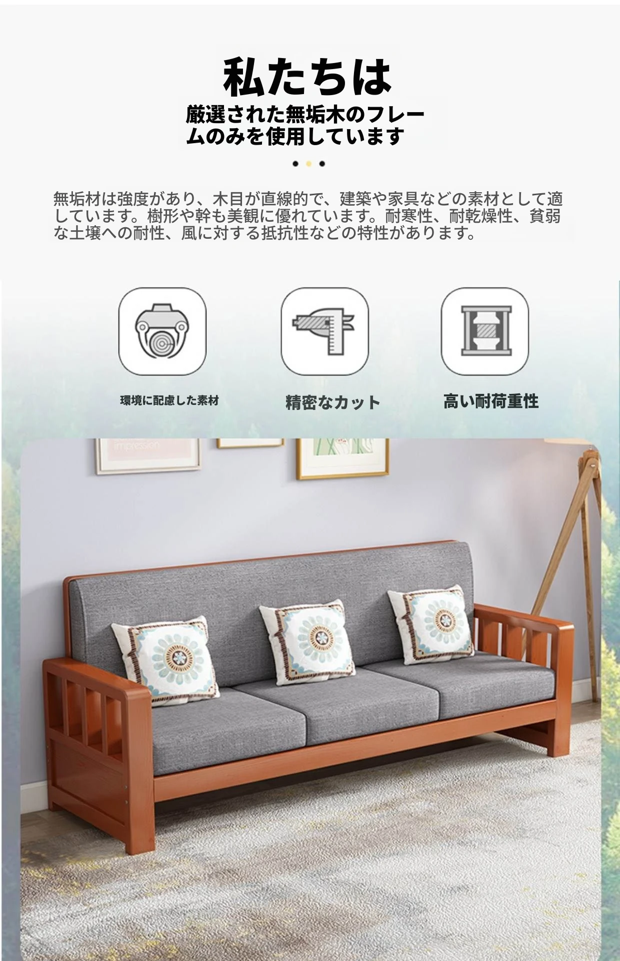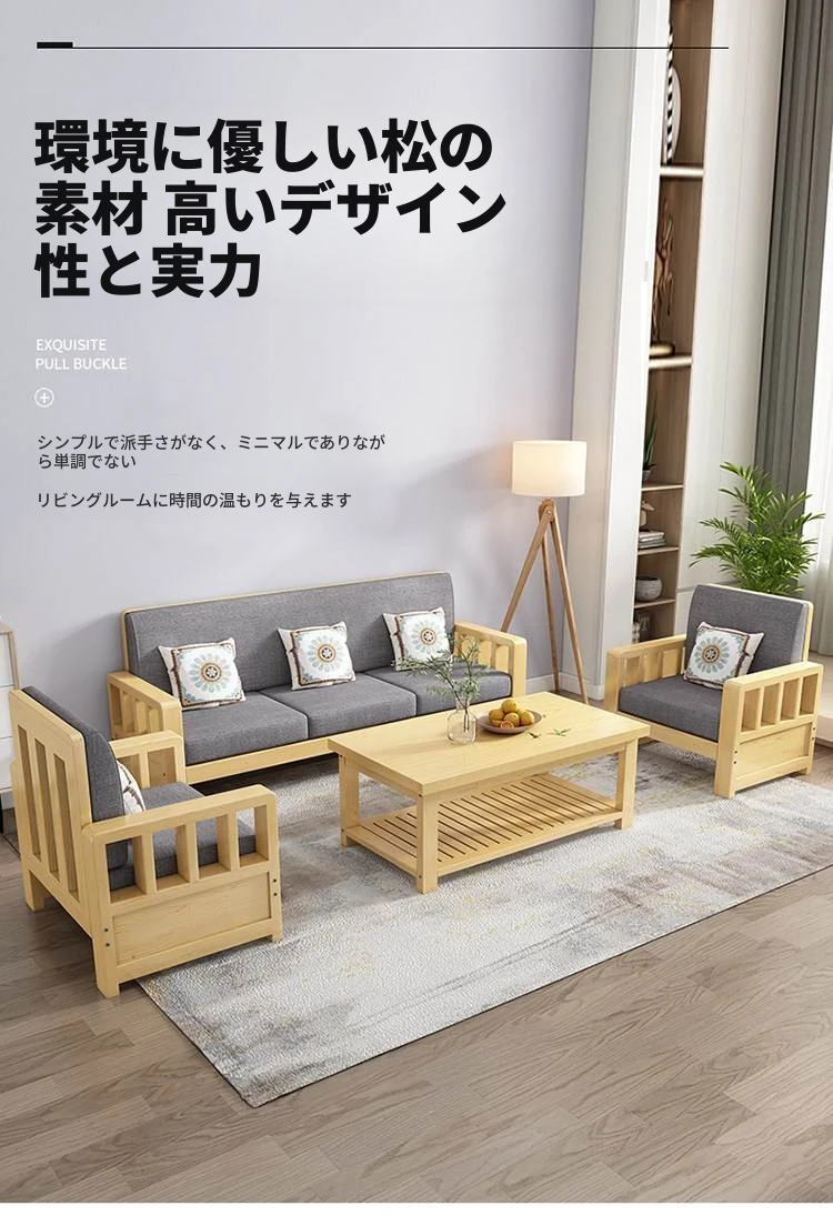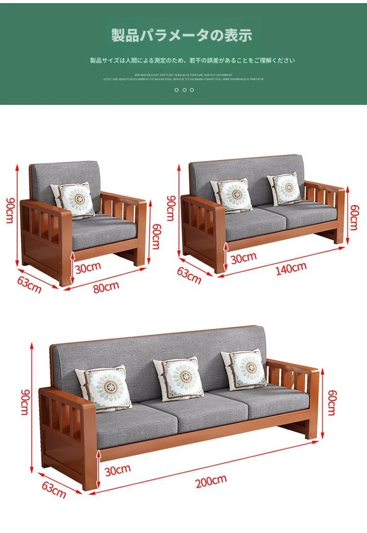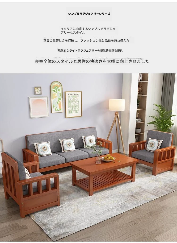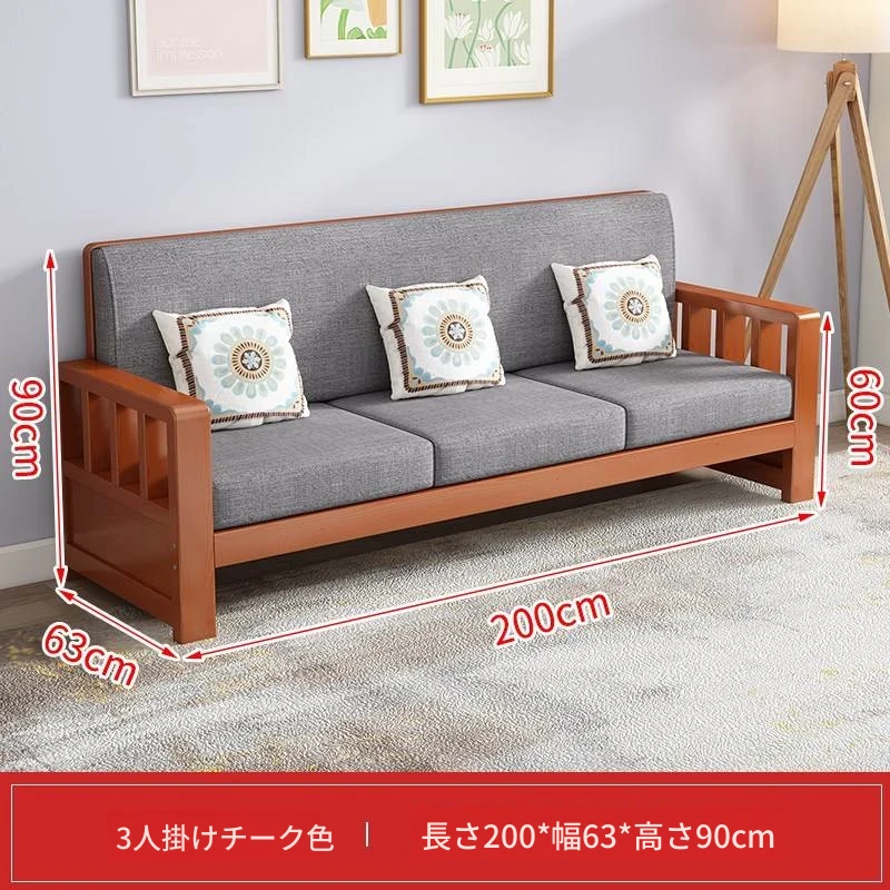 現代的なシンプルデザインの無垢材ソファセット - 布製の三人掛け、小型住居に最適な新中式スタイルのソファベッド。おしゃれで快適なリビング空間を演出します!