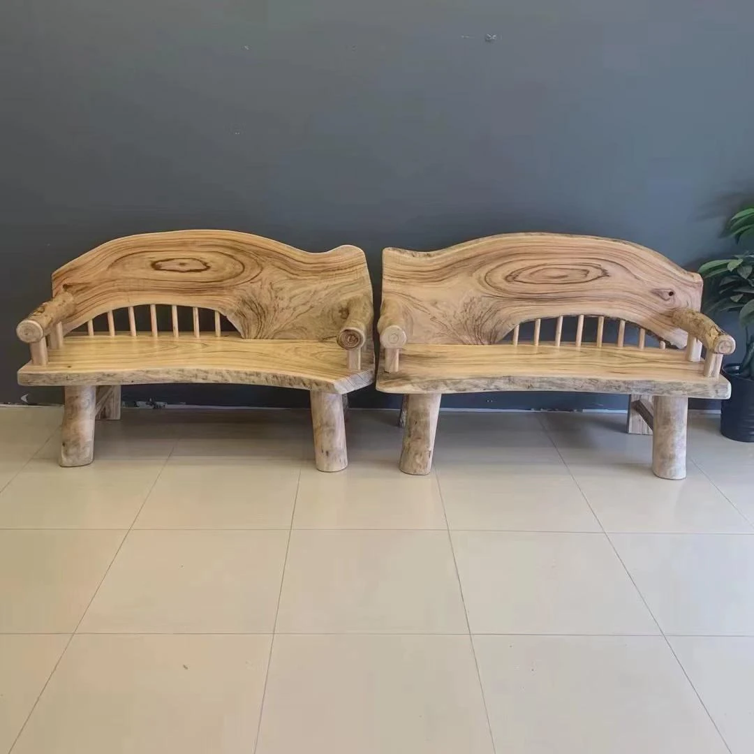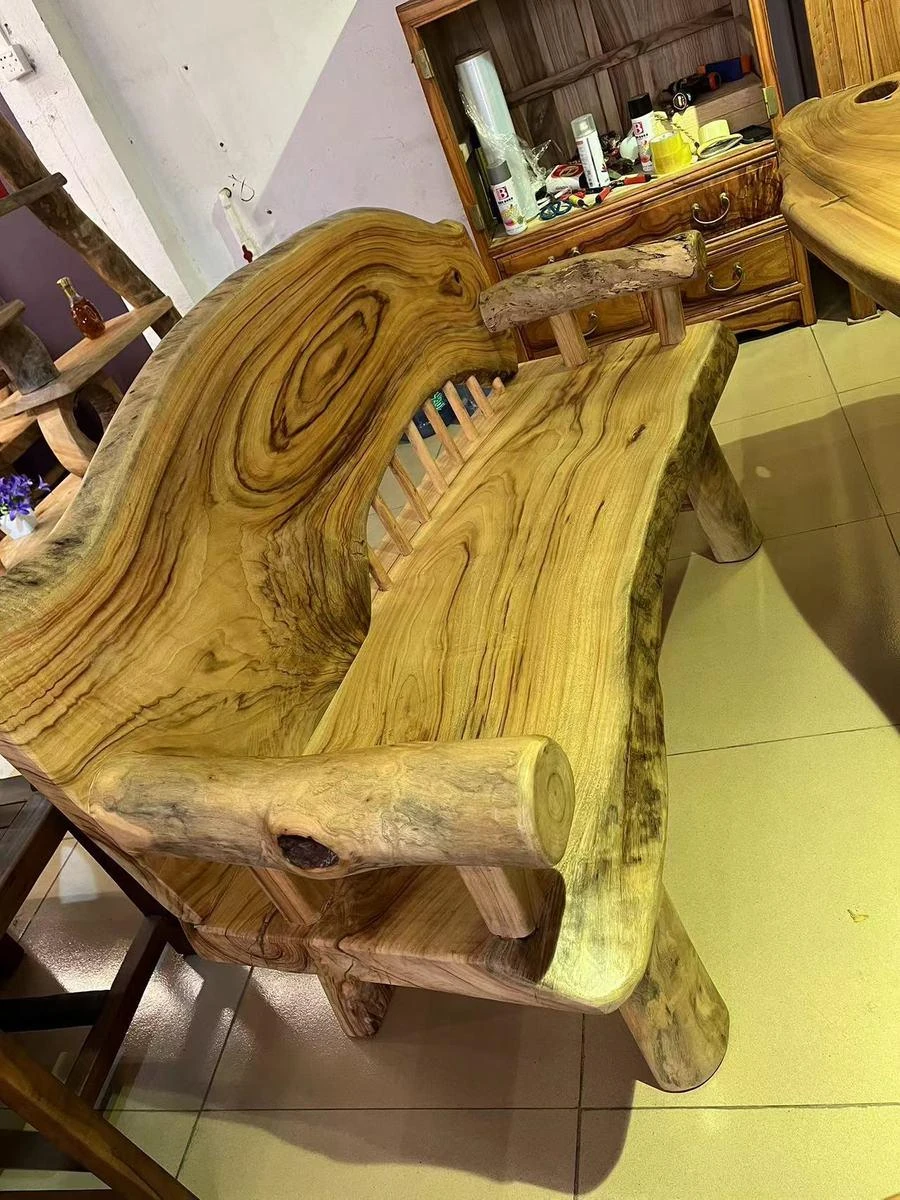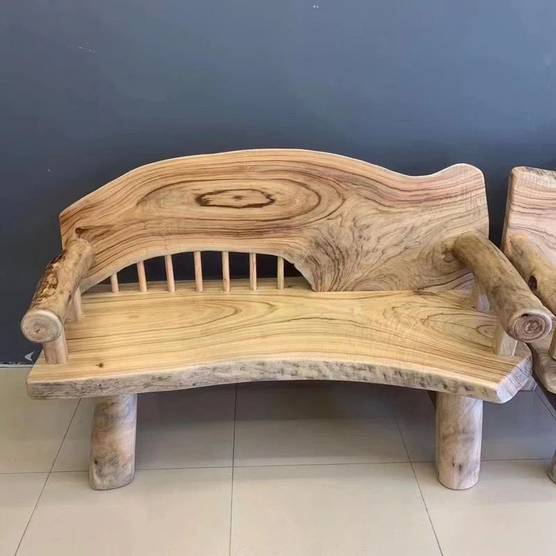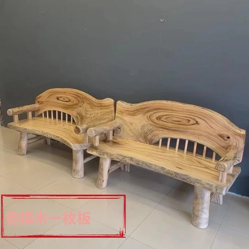 香樟木の無垢材を使用したシンプルでエコな3人掛けソファベンチ。個性的なデザインのリクライニングチェアもセットで、リビングやアウトドアに最適な整装家具です。自然の温もりを感じる贅沢なひとときをお楽しみください。
