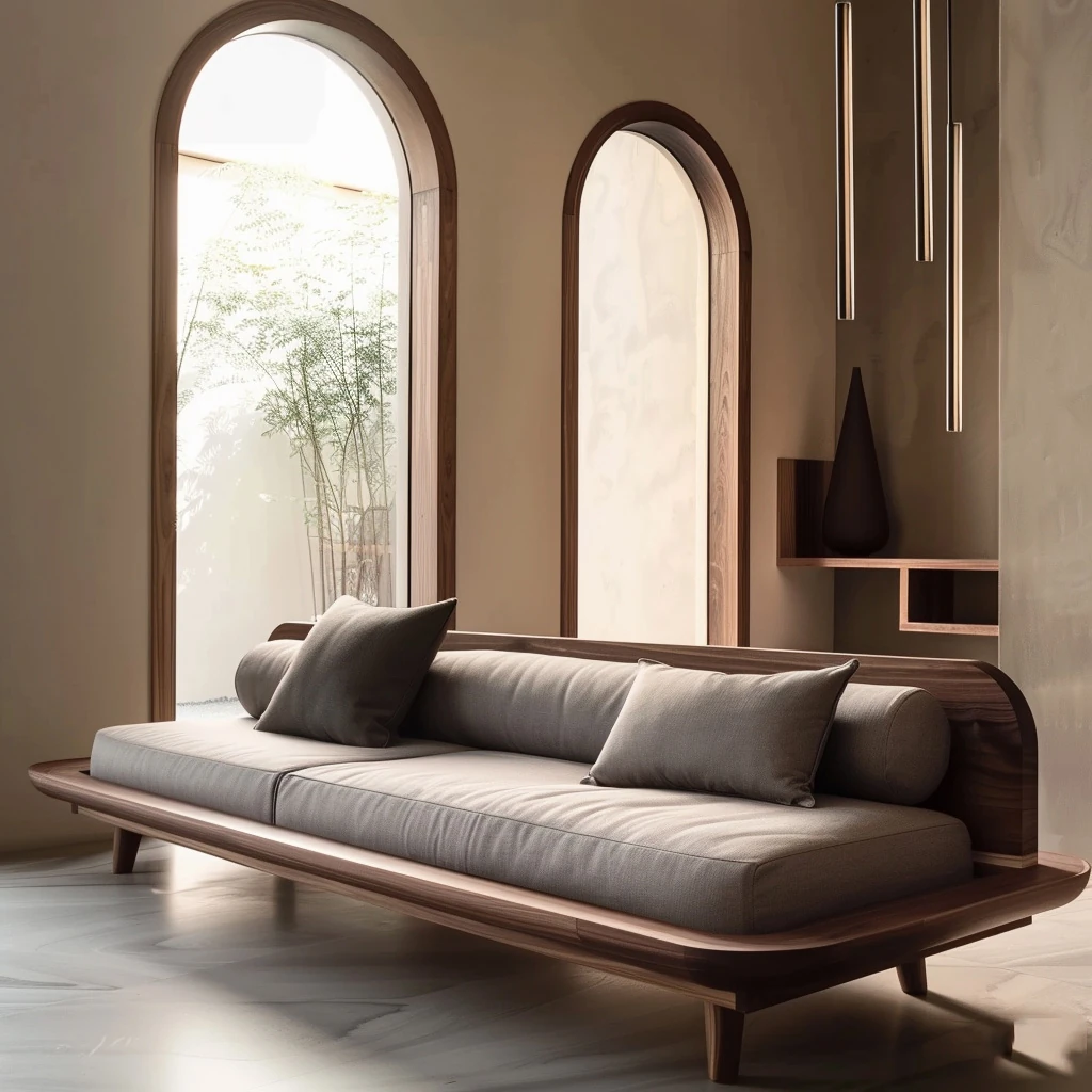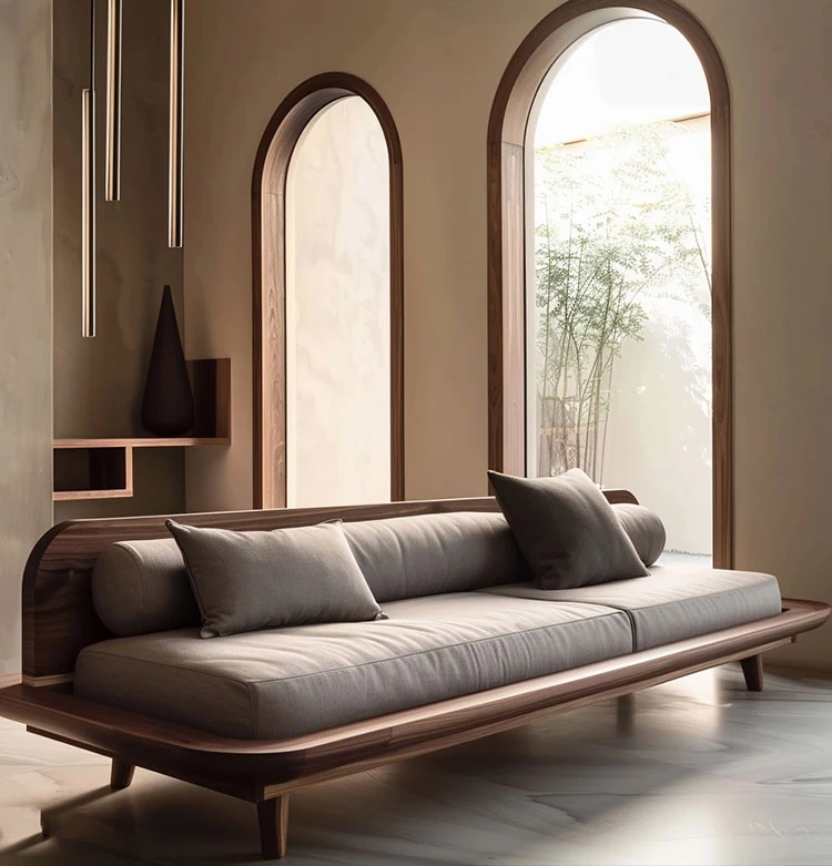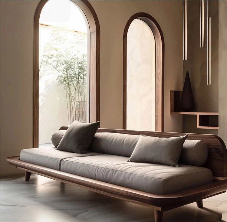 新中式デザインのイタリアンウォールナット製ソファ・カウチ、侘び寂びの風合いを持つローハンベッド。現代的でシンプルな民宿やホテルに最適なアイテム。心地よいひとときを演出します。