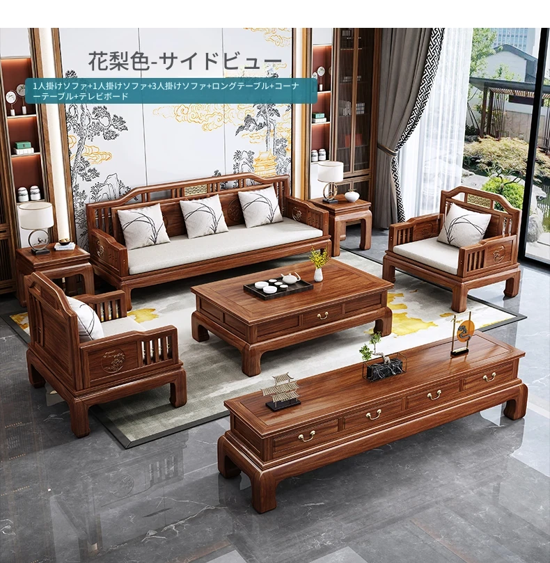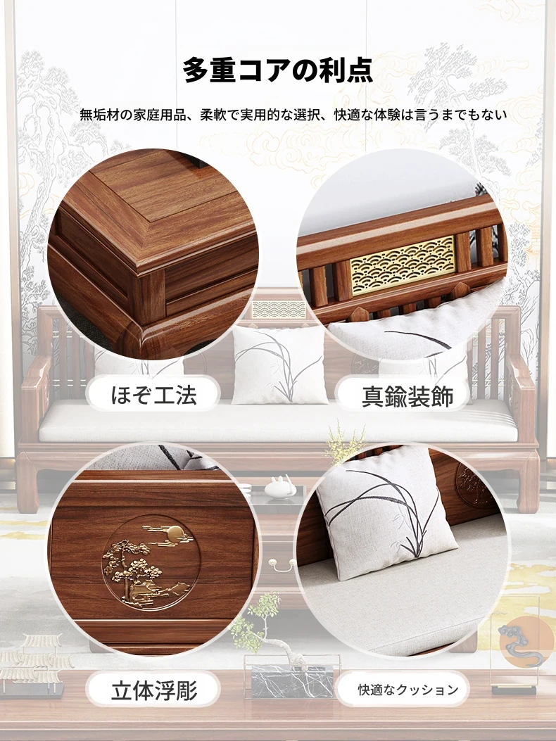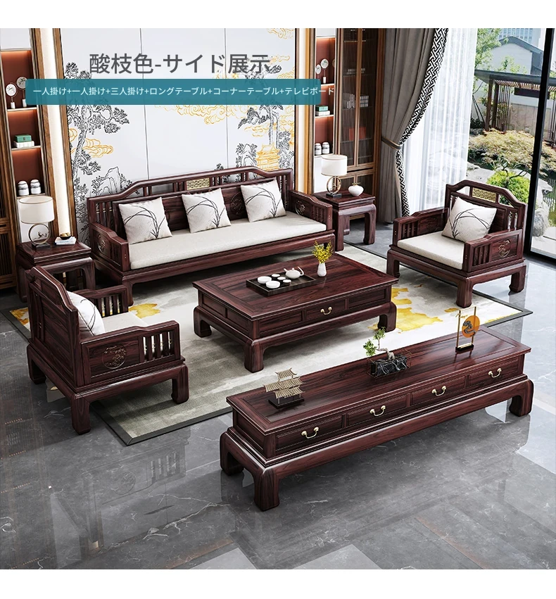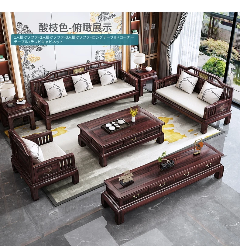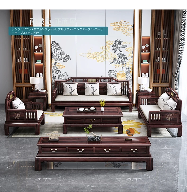 新中式金花梨木製の実木赤檀ソファセット - 菠萝格風のアンティーク彫刻、冬でも夏でも快適なリビング家具!