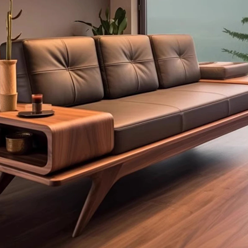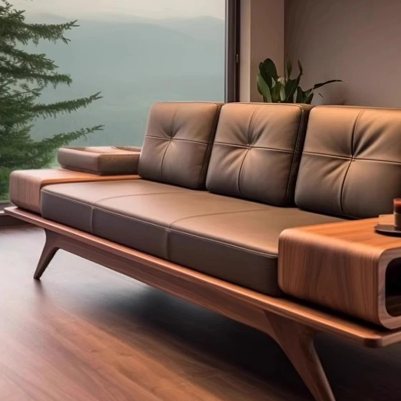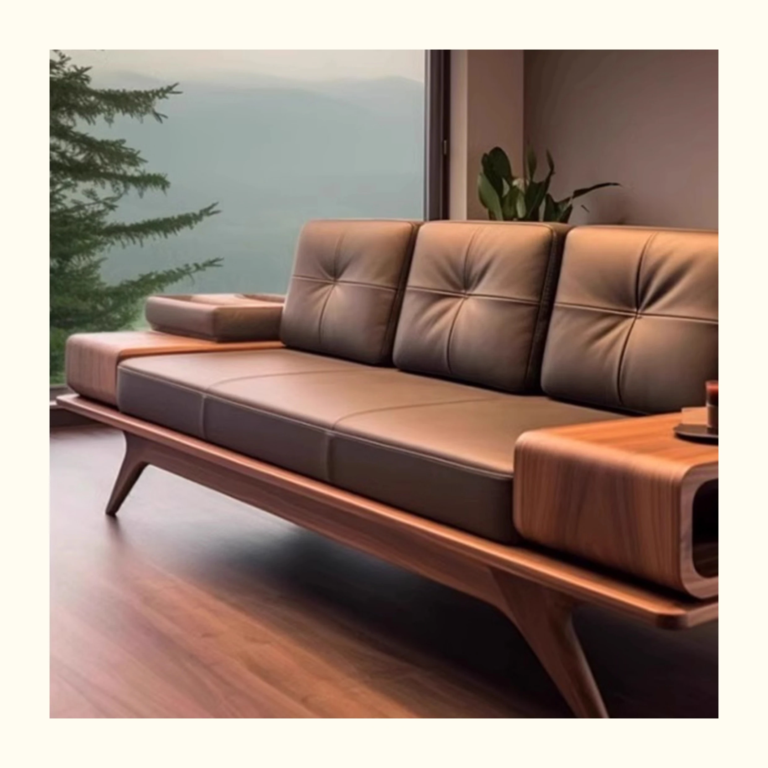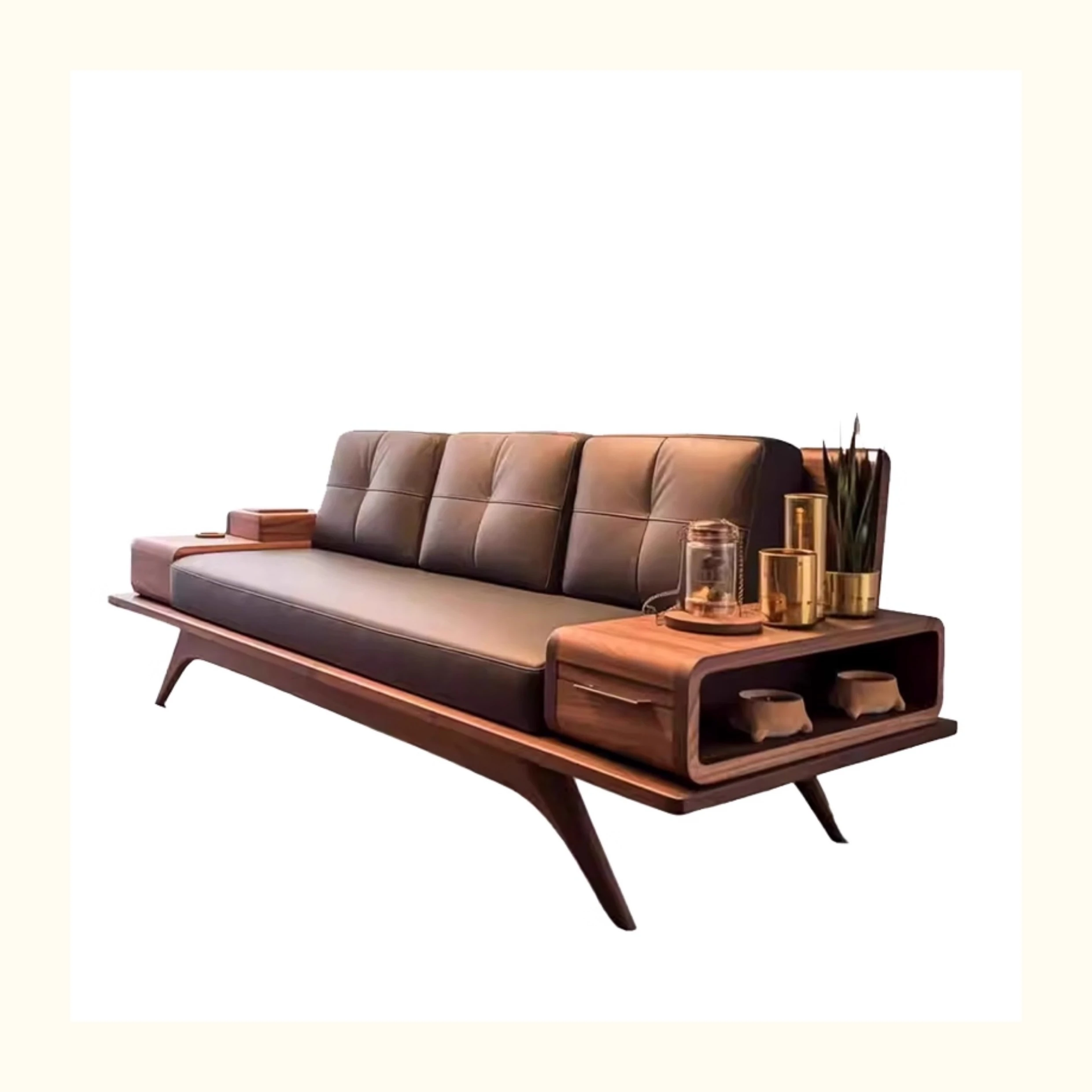 新作!高級感溢れる中古風ブラックウォルナットリビングソファー - ヴィラにもぴったりな本革&無垢材使用で、贅沢なひとときを演出します!