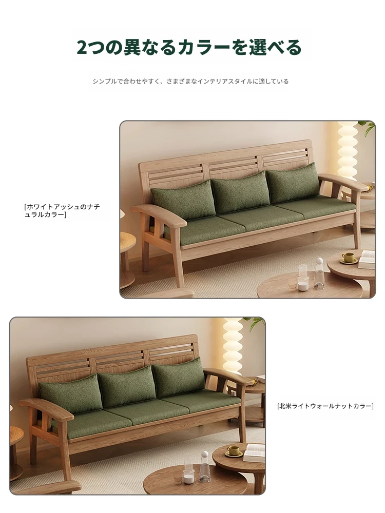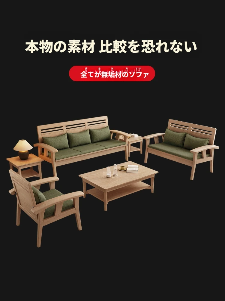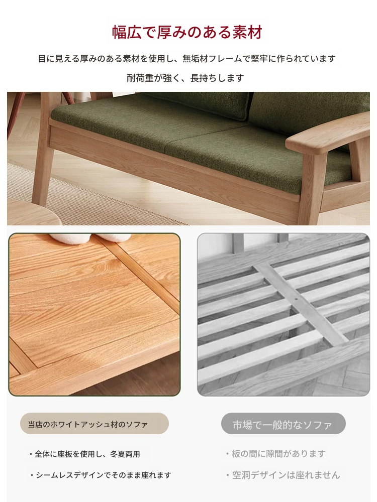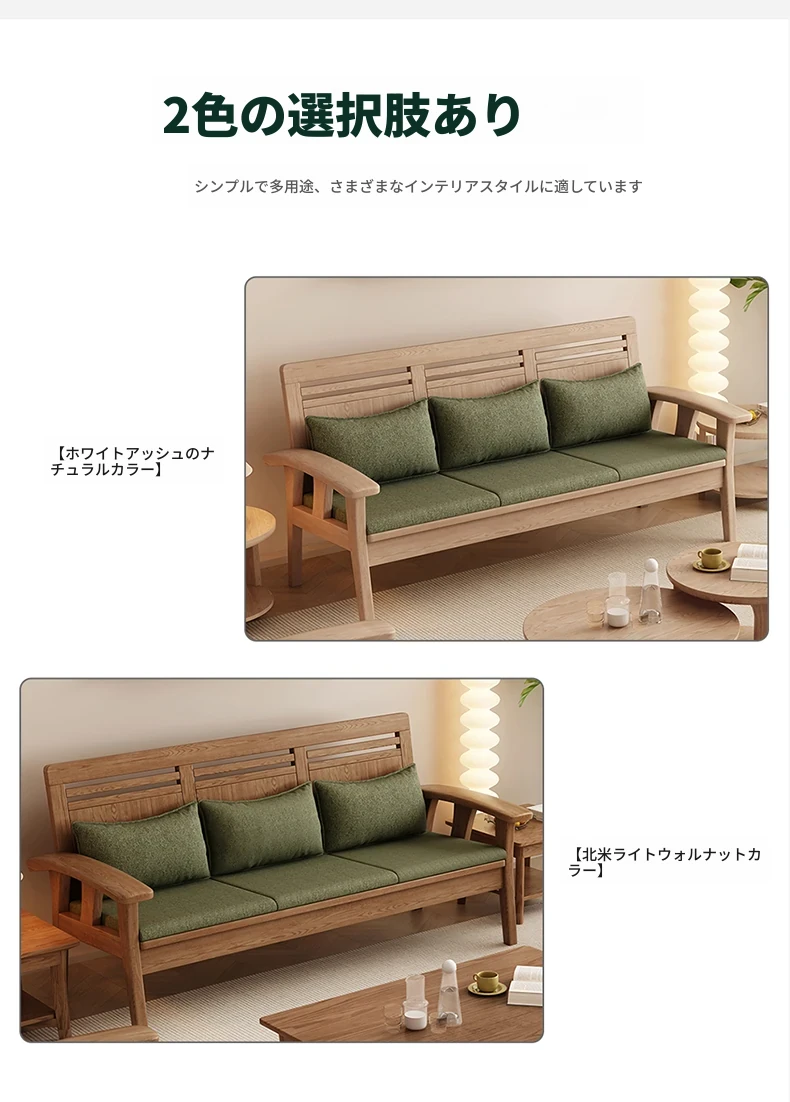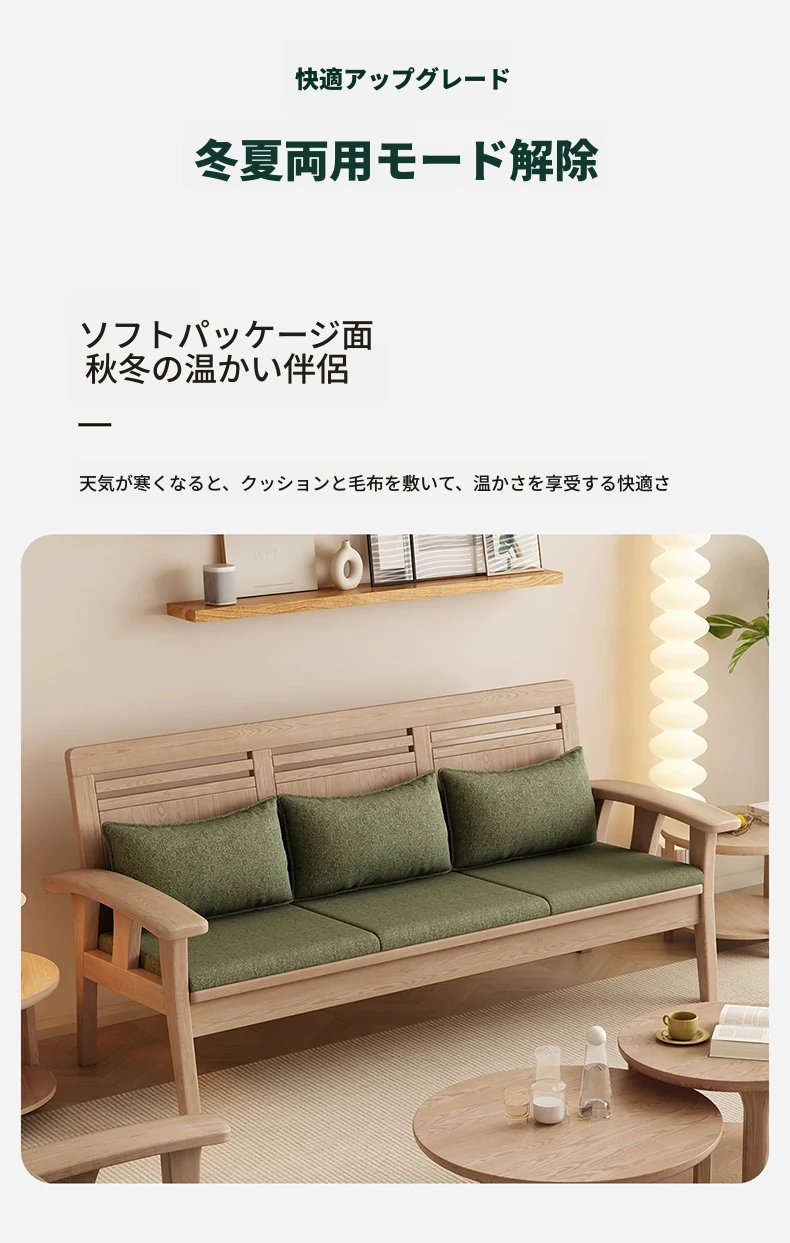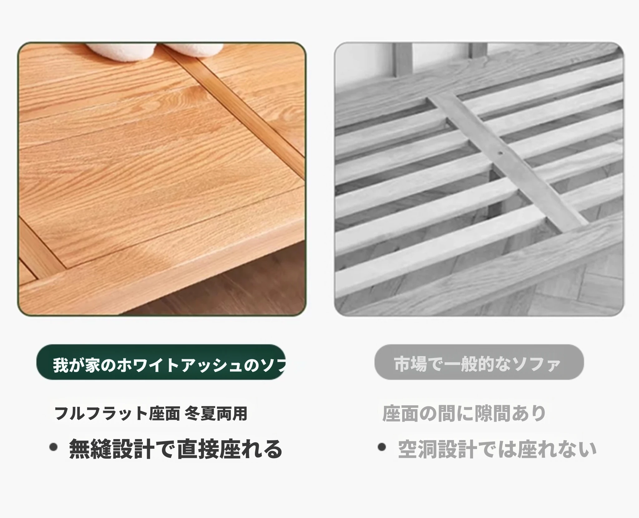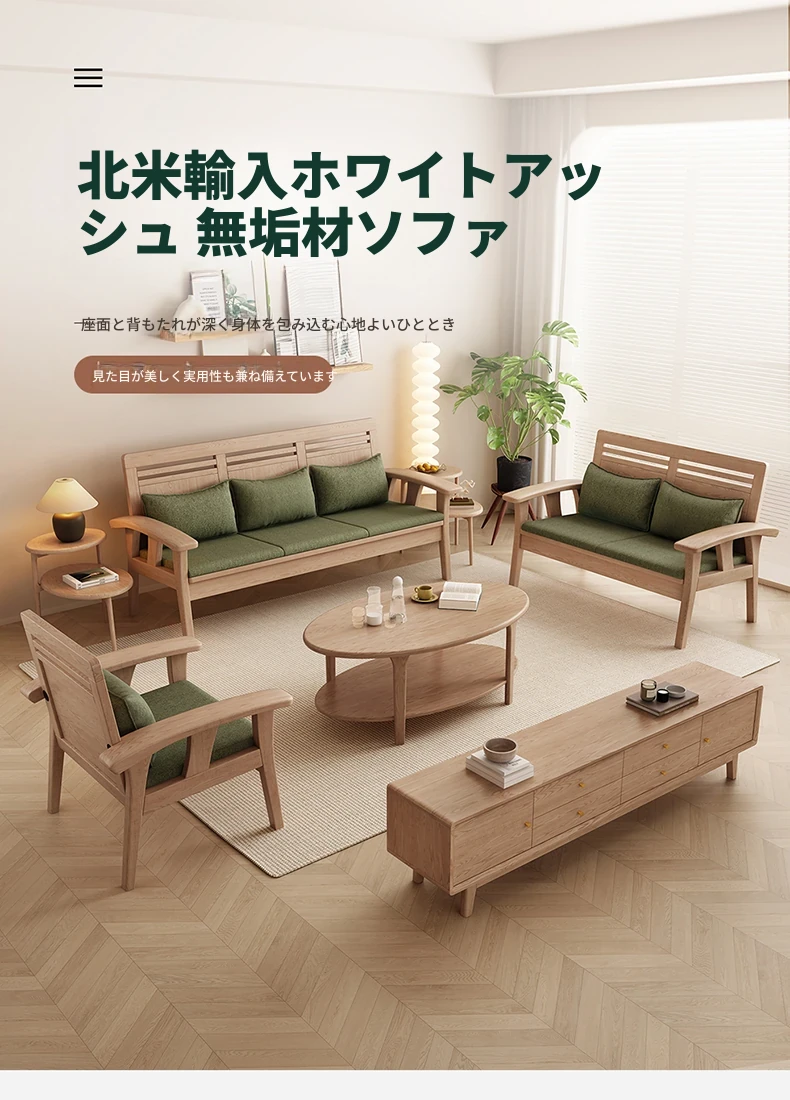 北欧スタイルのホワイトアッシュ無垢材ソファセット - モダンでシンプルなお部屋にぴったり!小さなお家に最適なデザイン、民宿にもおすすめの木製家具です。