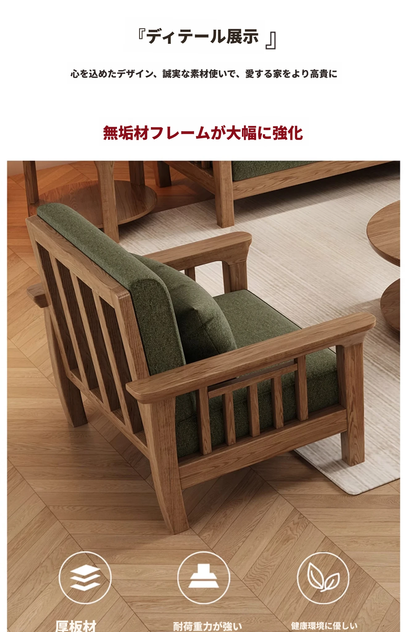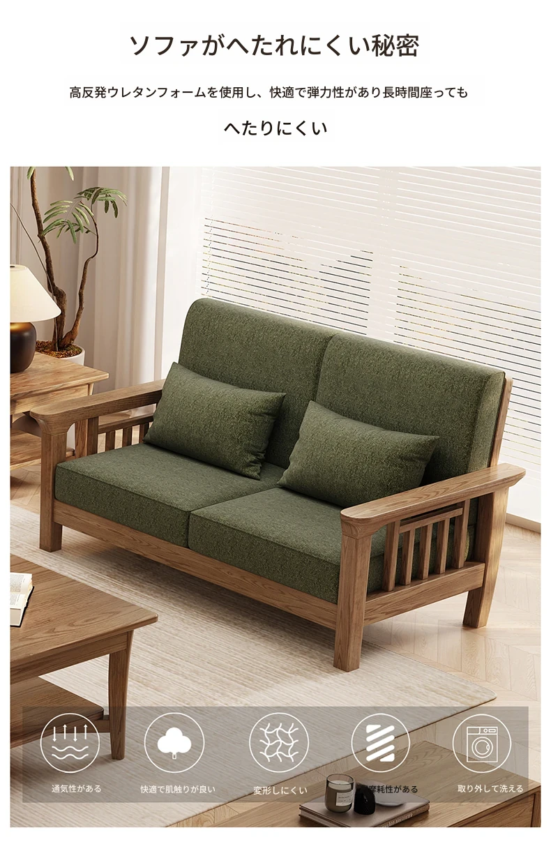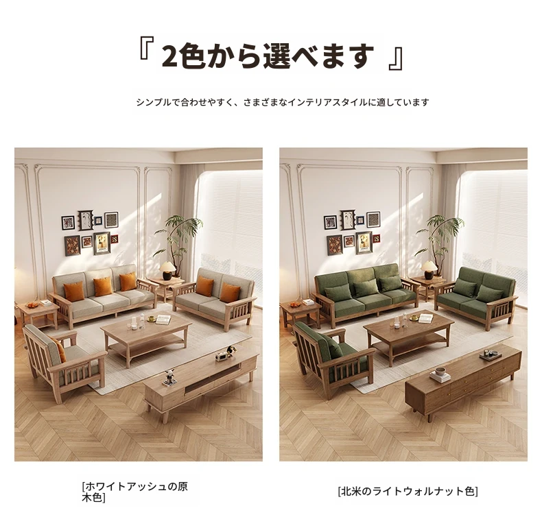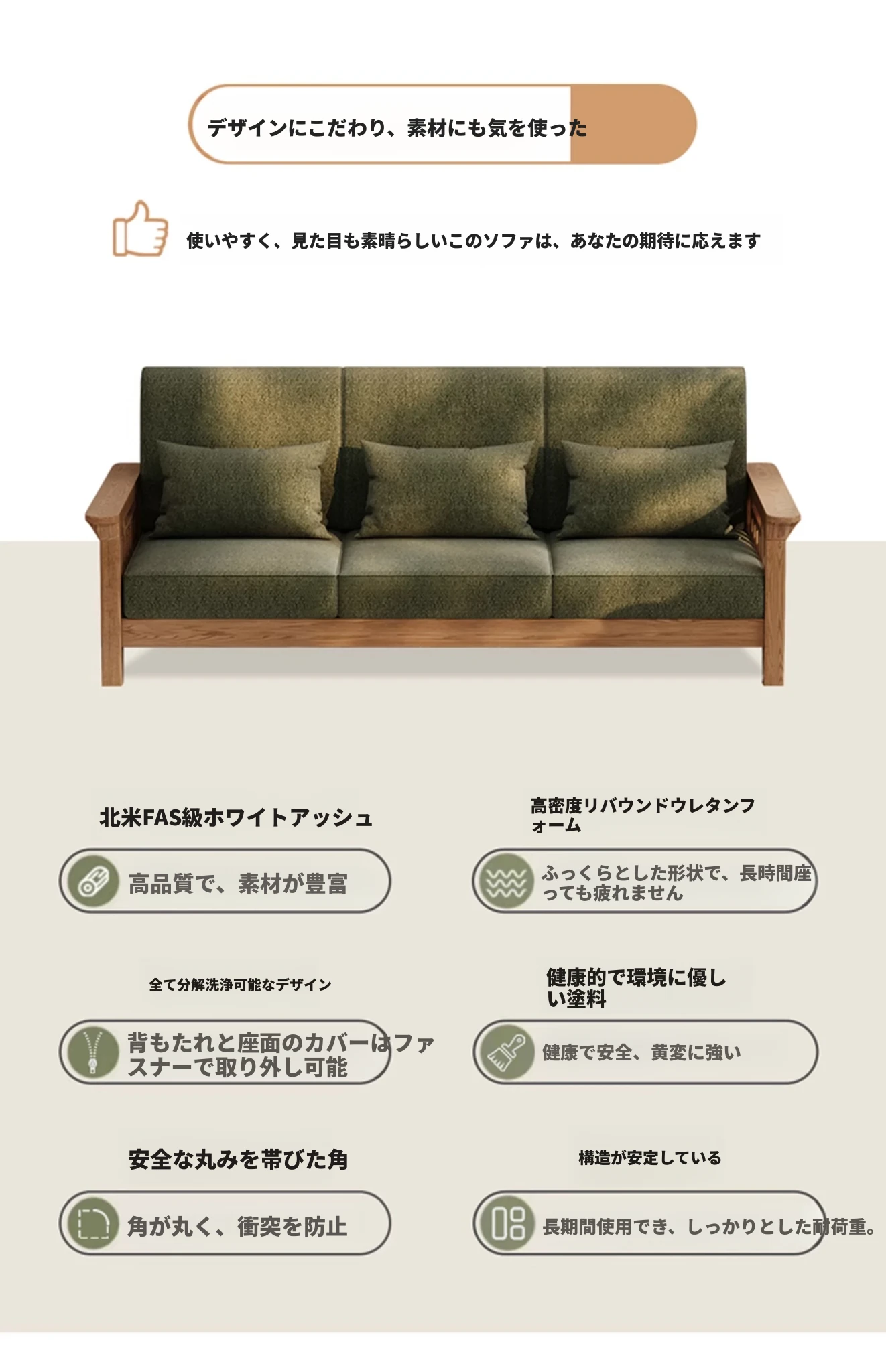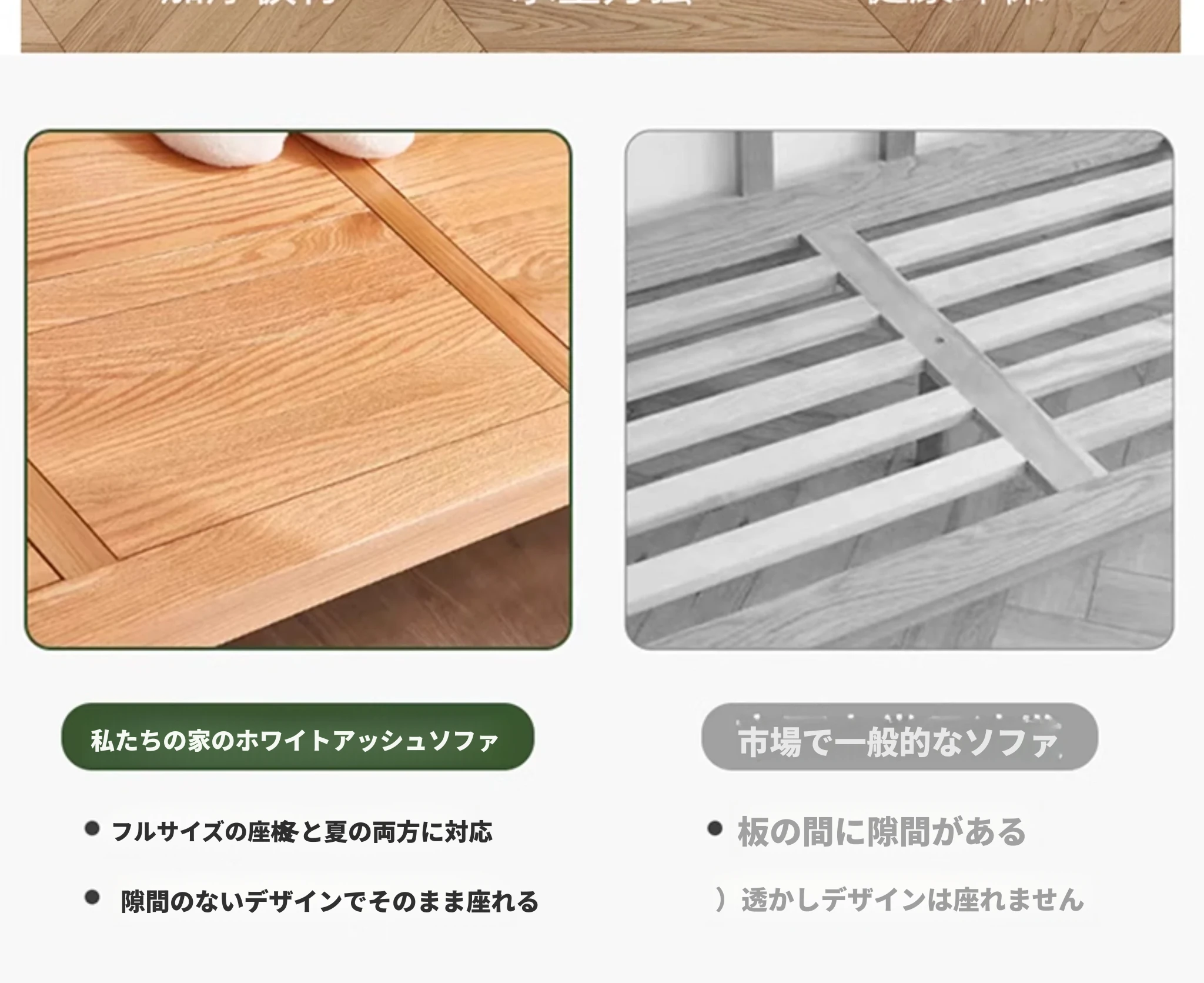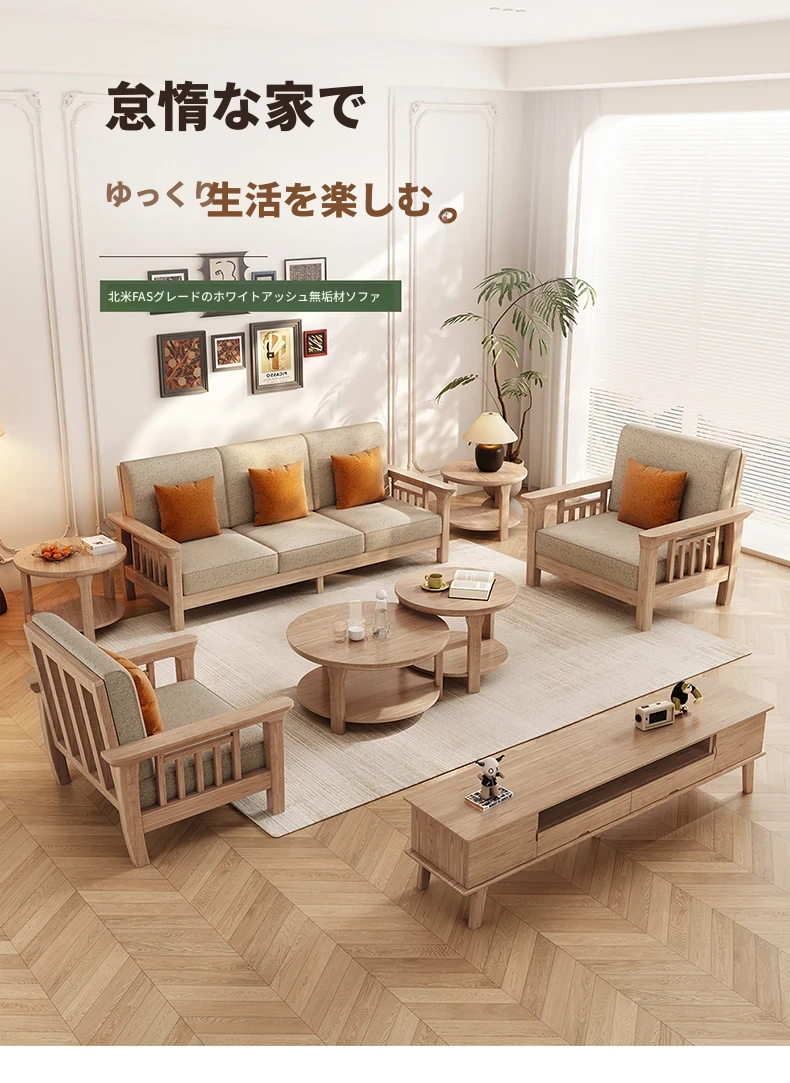 北欧スタイルのホワイトアッシュ無垢材ソファセット - 小型リビングに最適な3人掛け直置きソファ!ナチュラルな原木風のデザインで、民宿やおしゃれな空間にぴったり!快適さとスタイルを兼ね備えた家具で、心地よいひとときを。