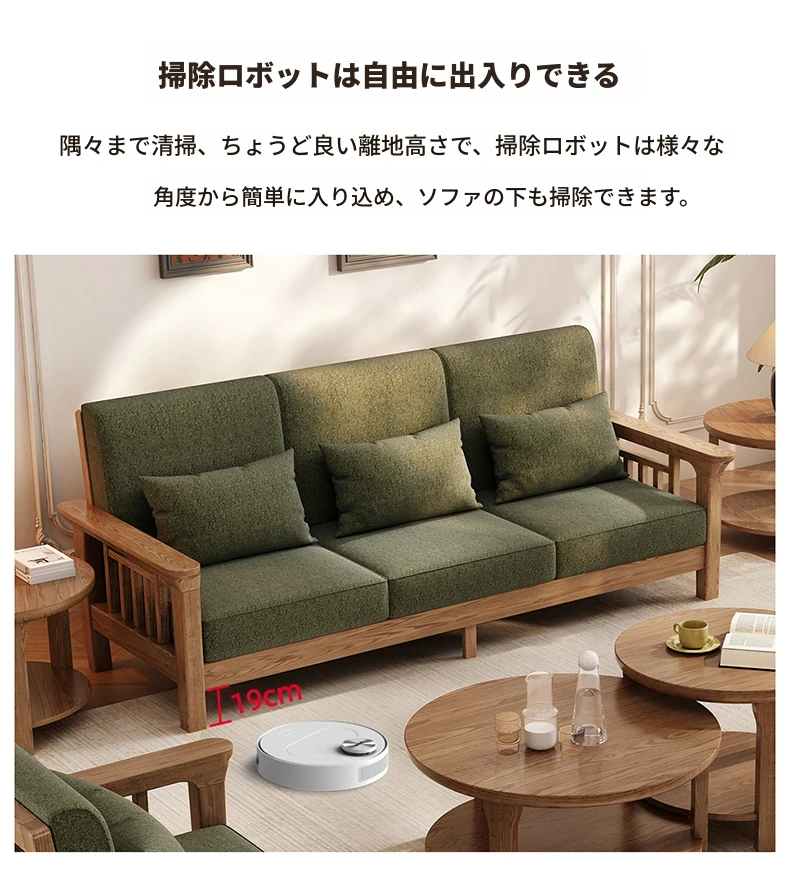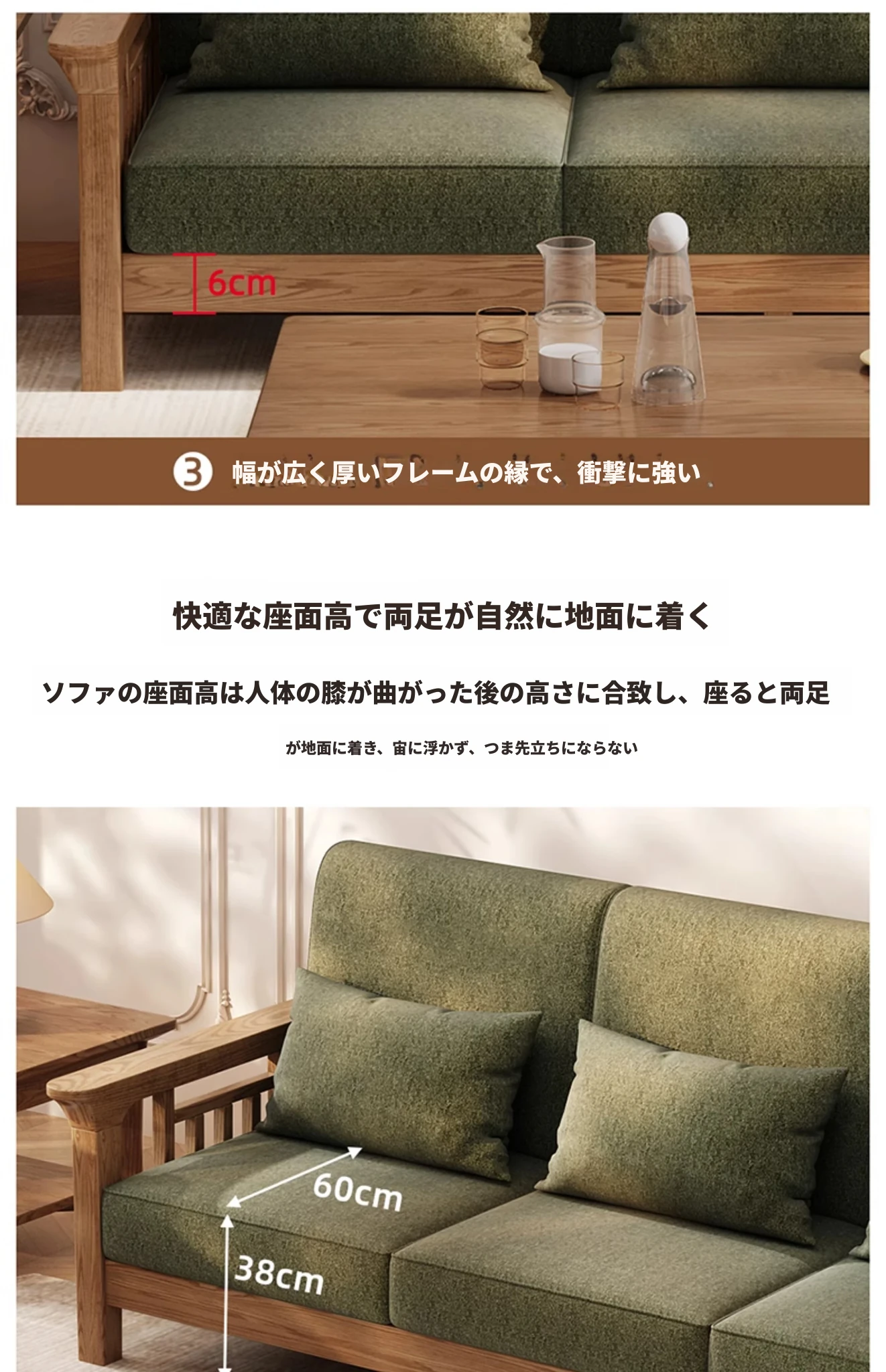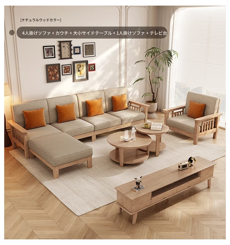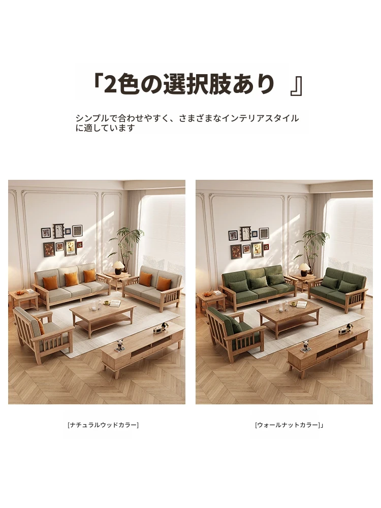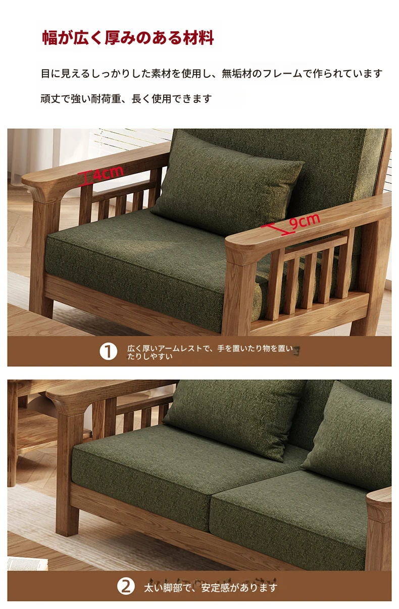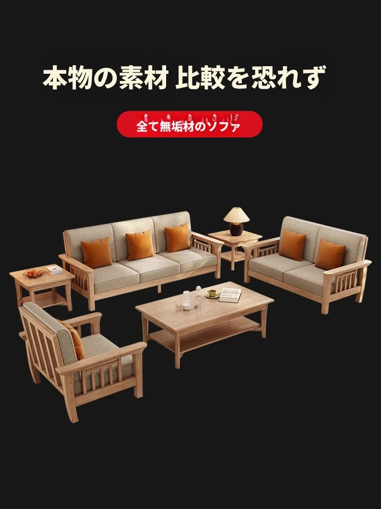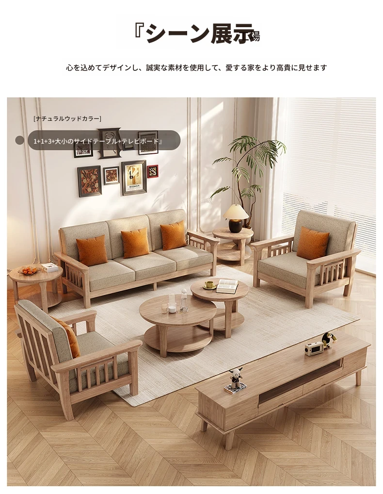 北欧スタイルのホワイトアッシュ無垢材ソファセット - 小型リビングに最適な3人掛け直置きソファ!ナチュラルな原木風のデザインで、民宿やおしゃれな空間にぴったり!快適さとスタイルを兼ね備えた家具で、心地よいひとときを。