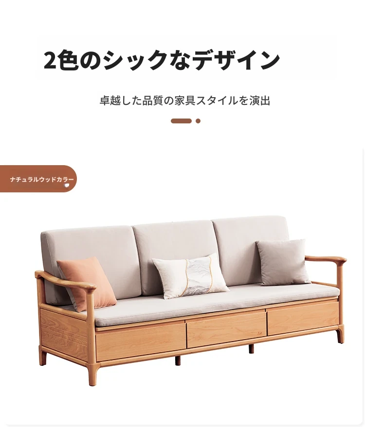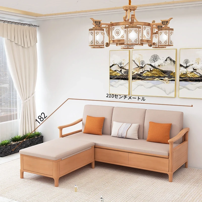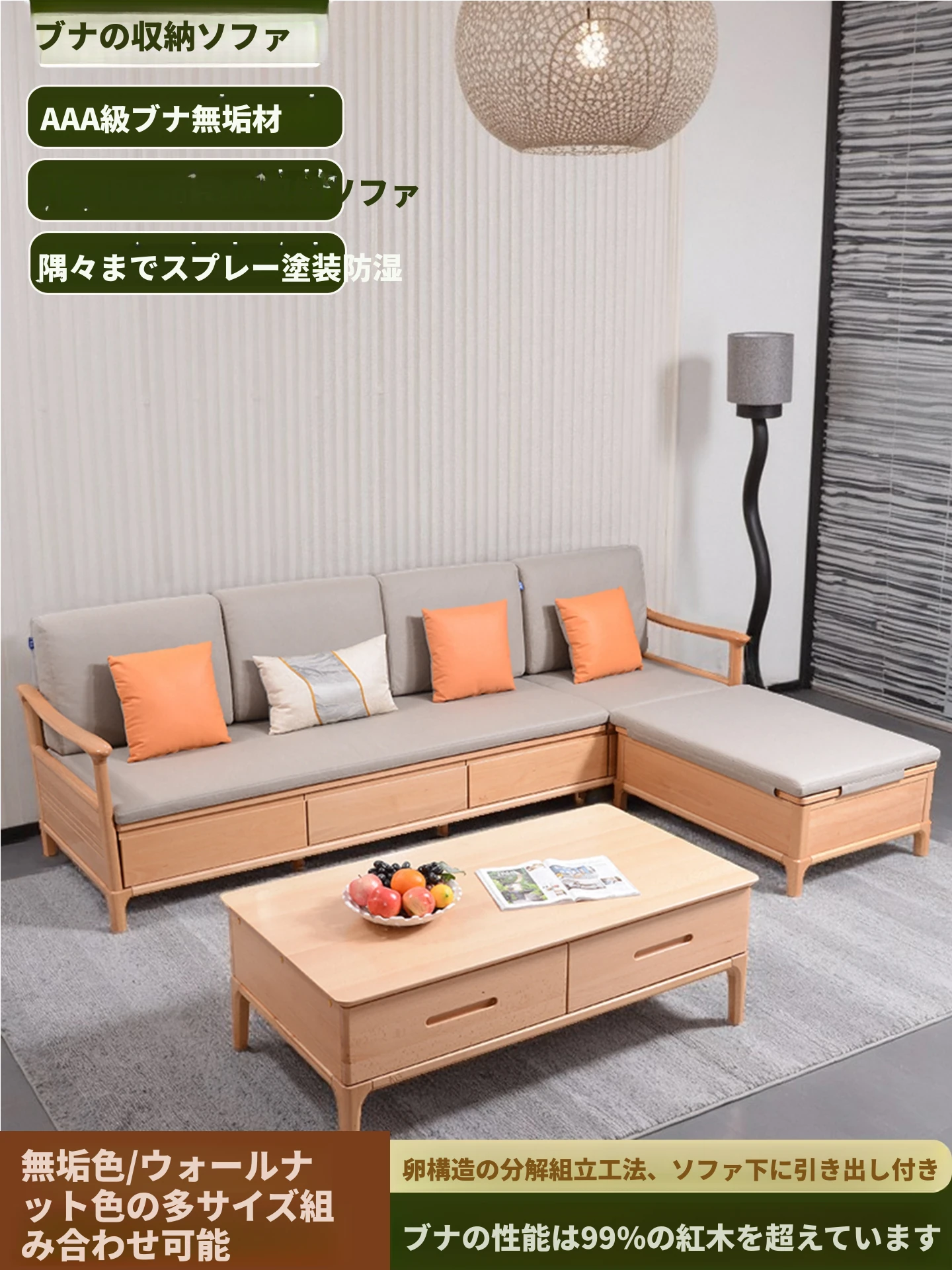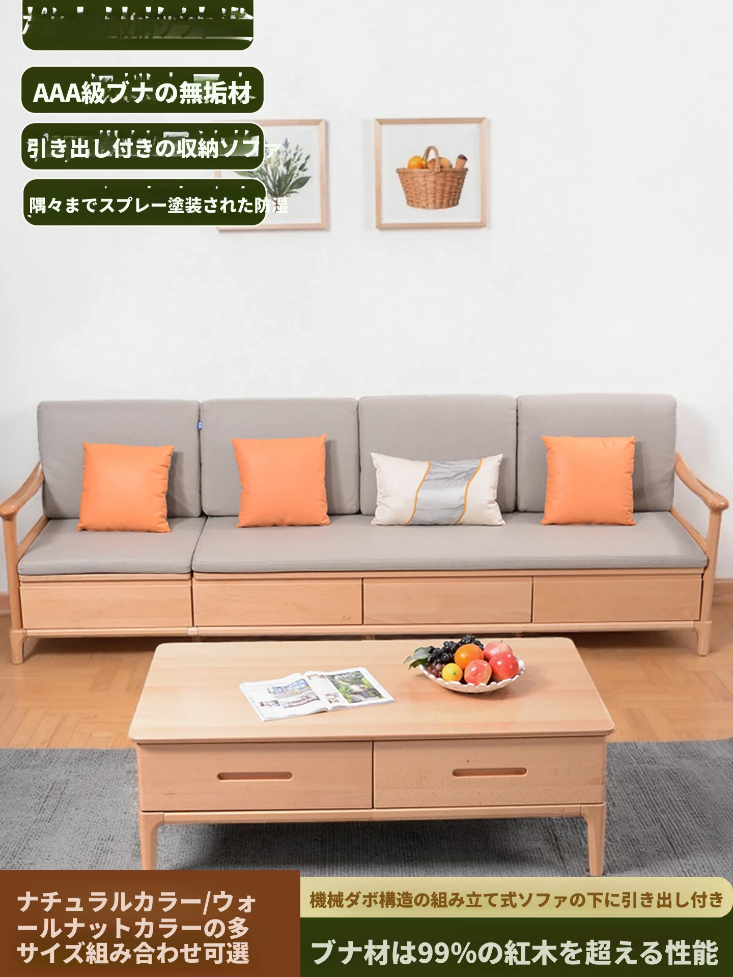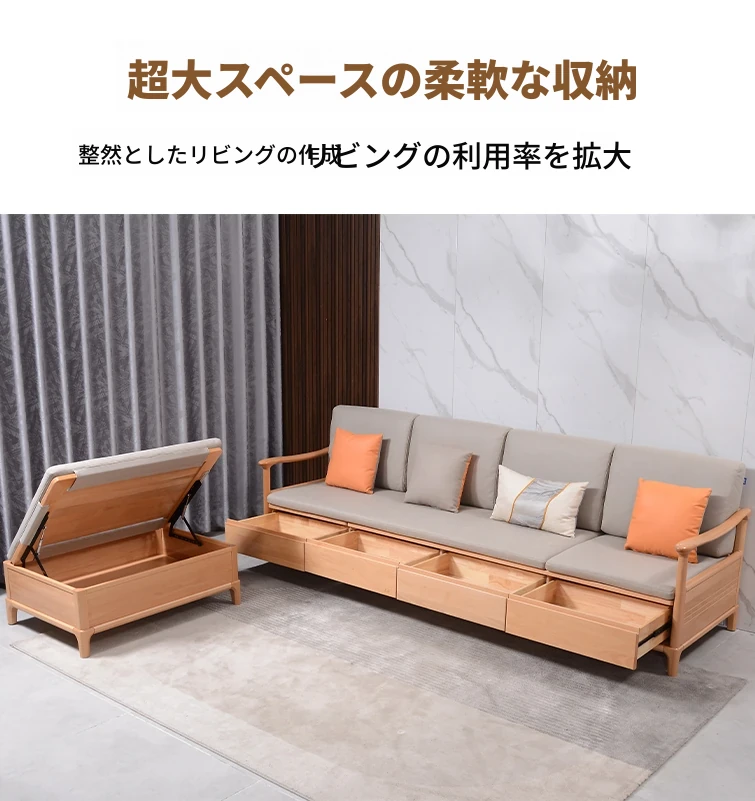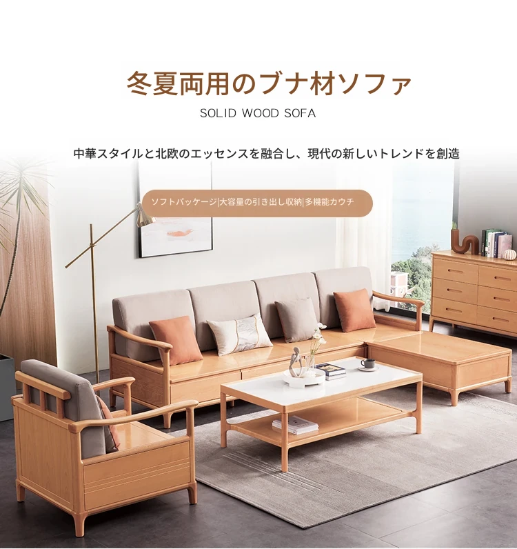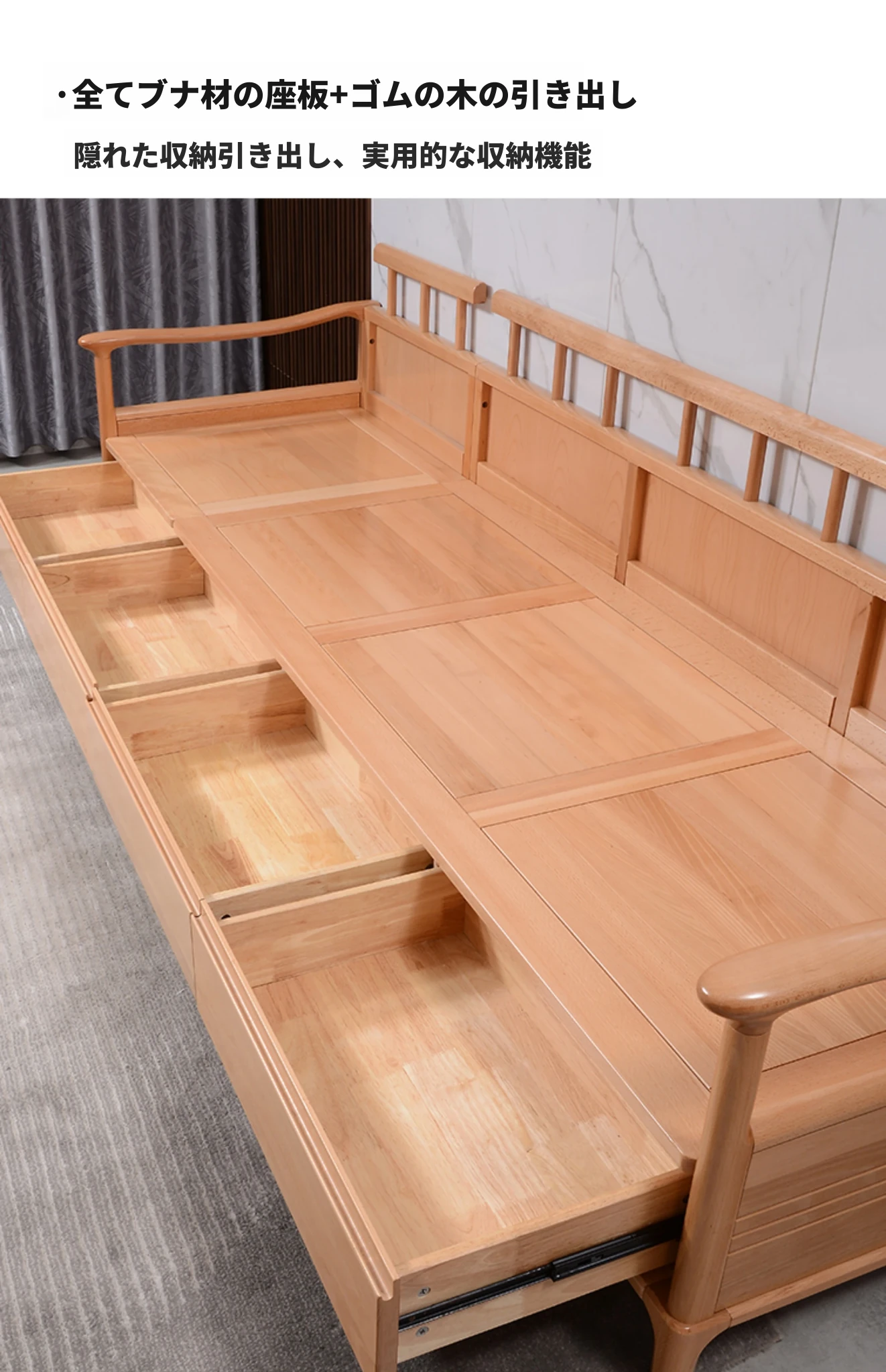 尚木 全実木ビーチウッドソファ 引き出し収納付き 新中式デザイン リビングルームに最適なナチュラルファブリックソファ