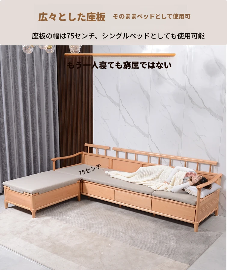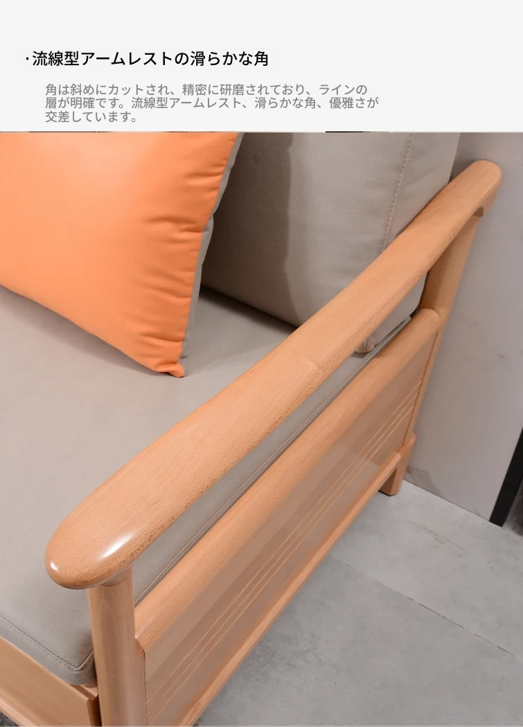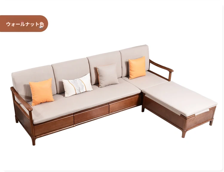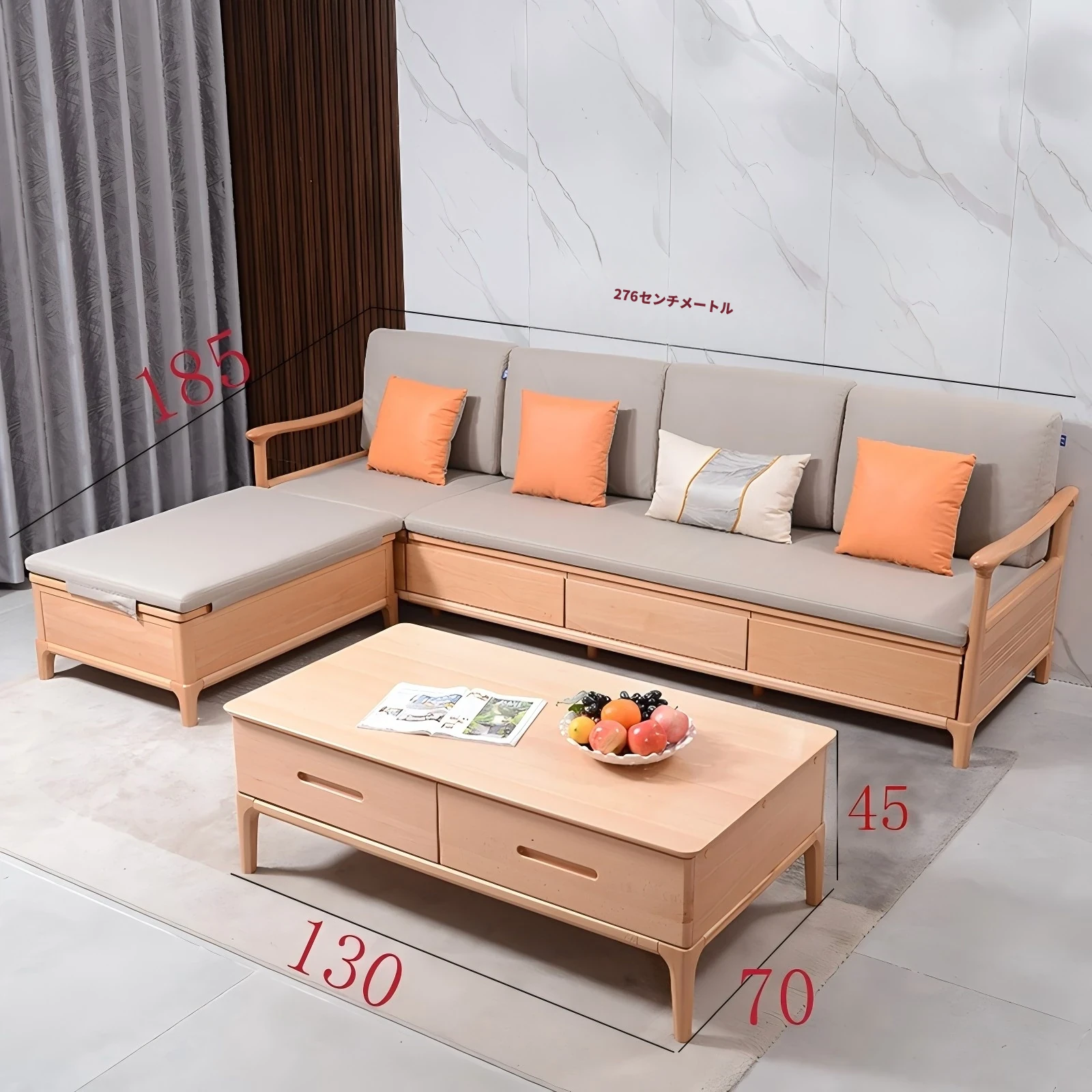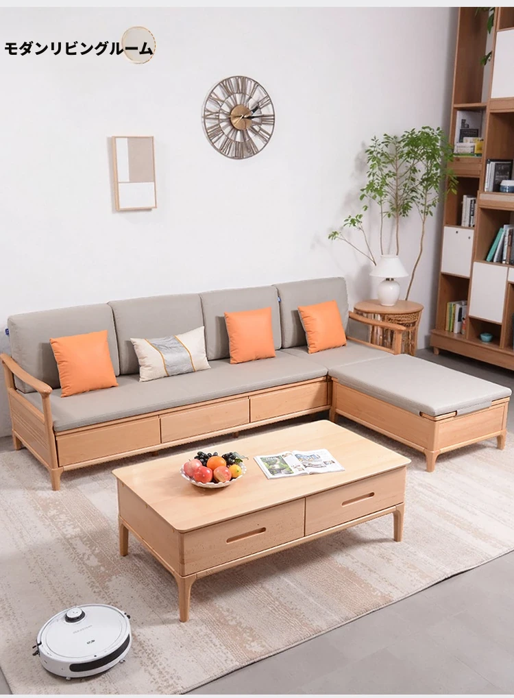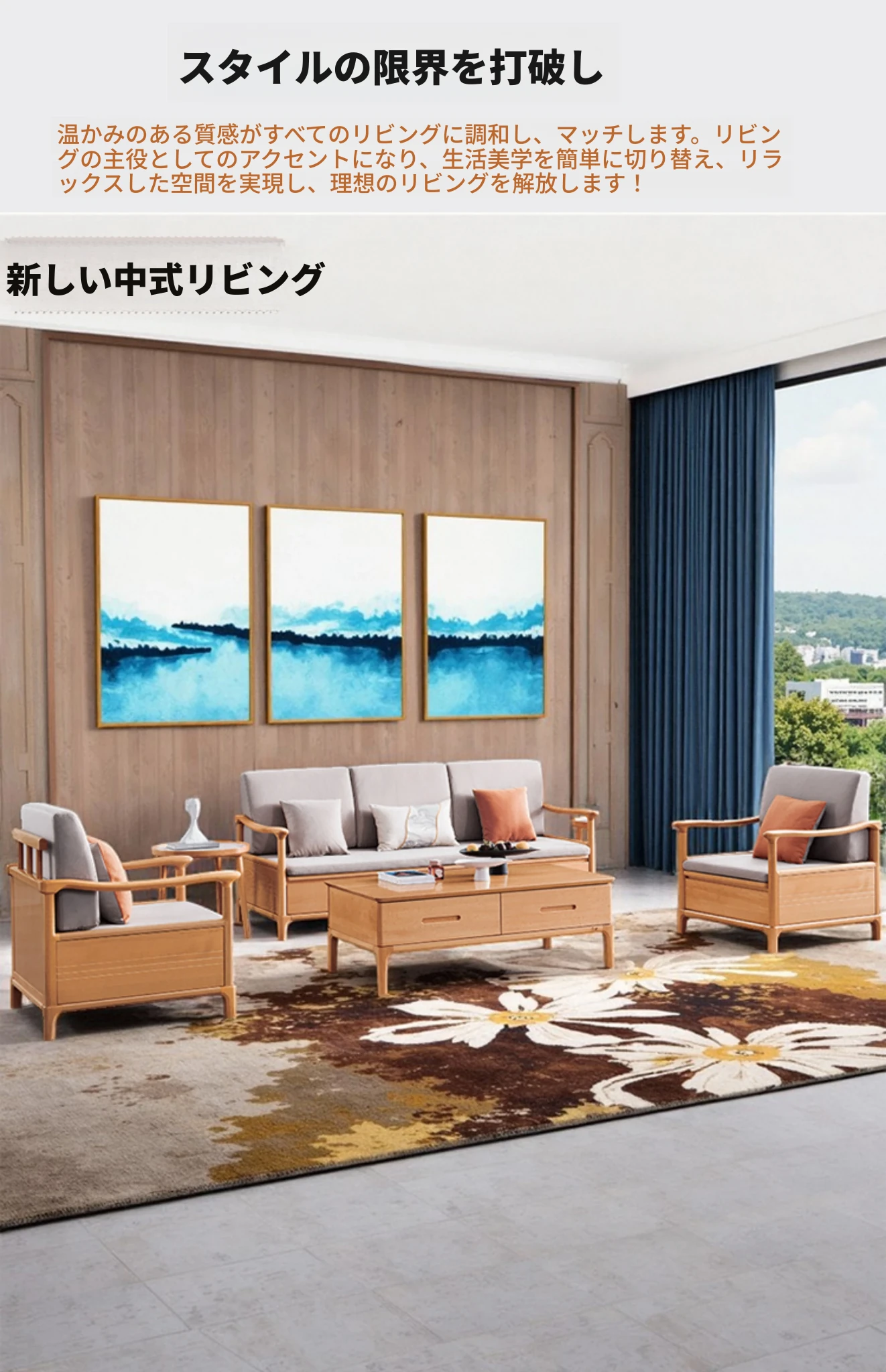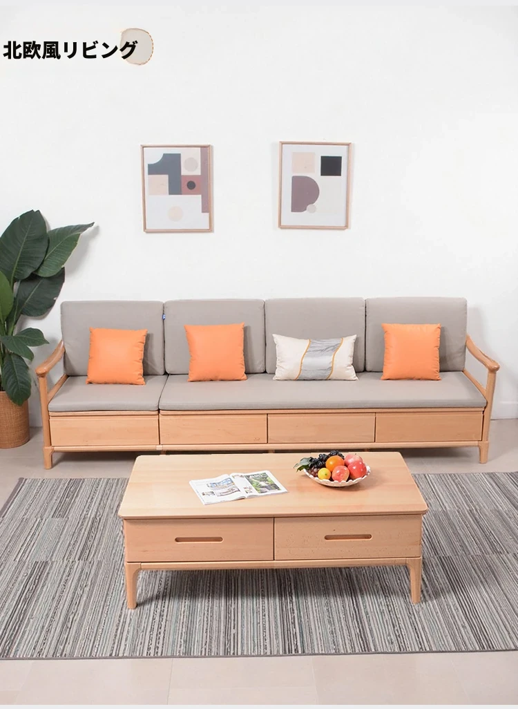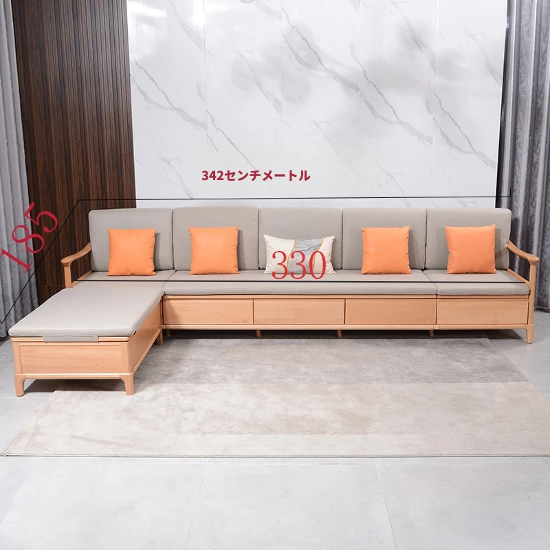 尚木 全実木ビーチウッドソファ 引き出し収納付き 新中式デザイン リビングルームに最適なナチュラルファブリックソファ