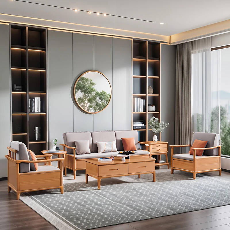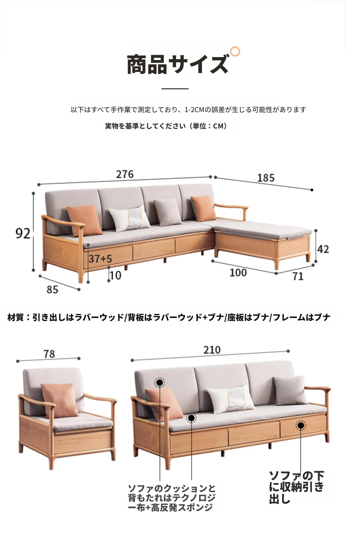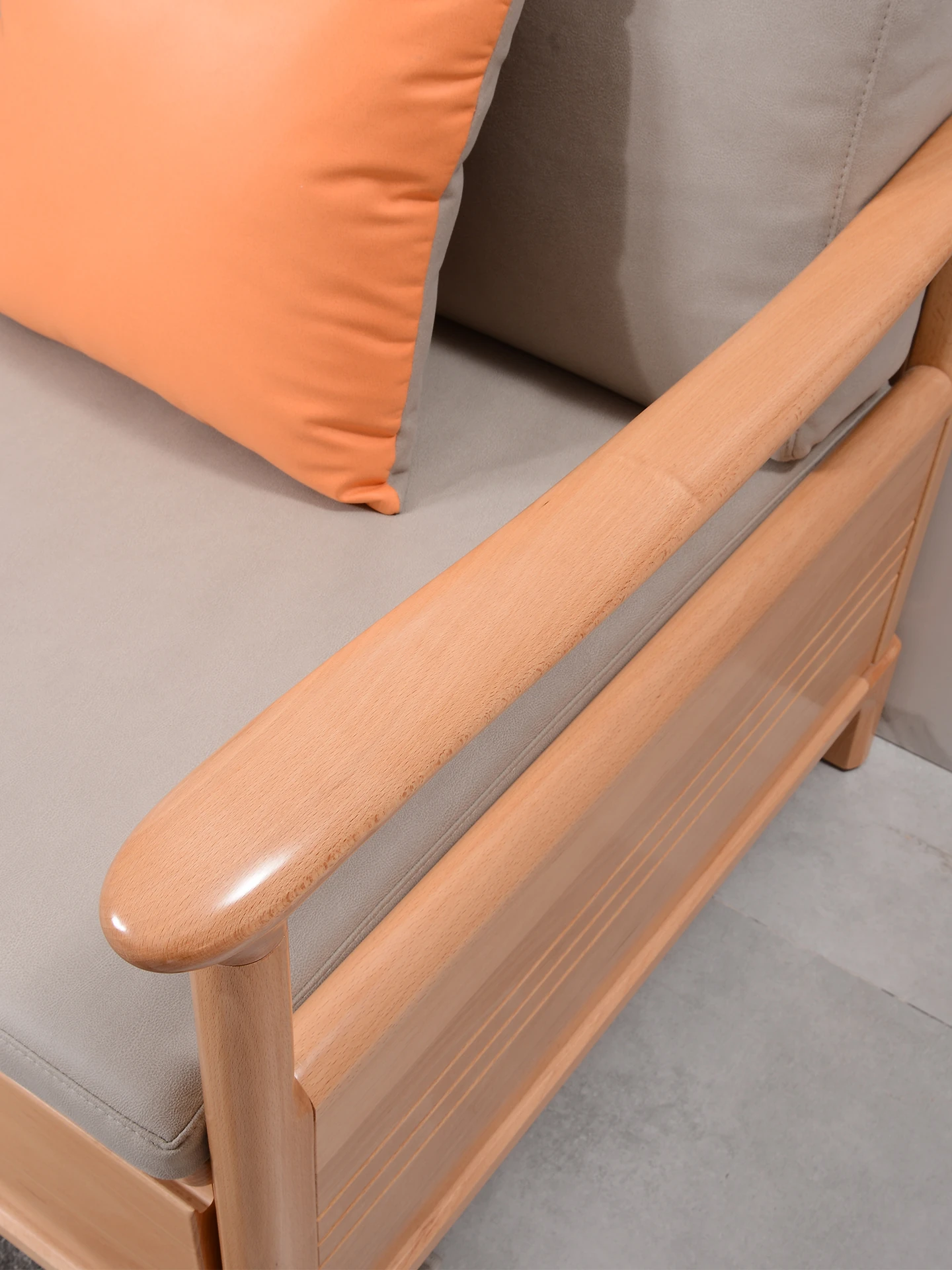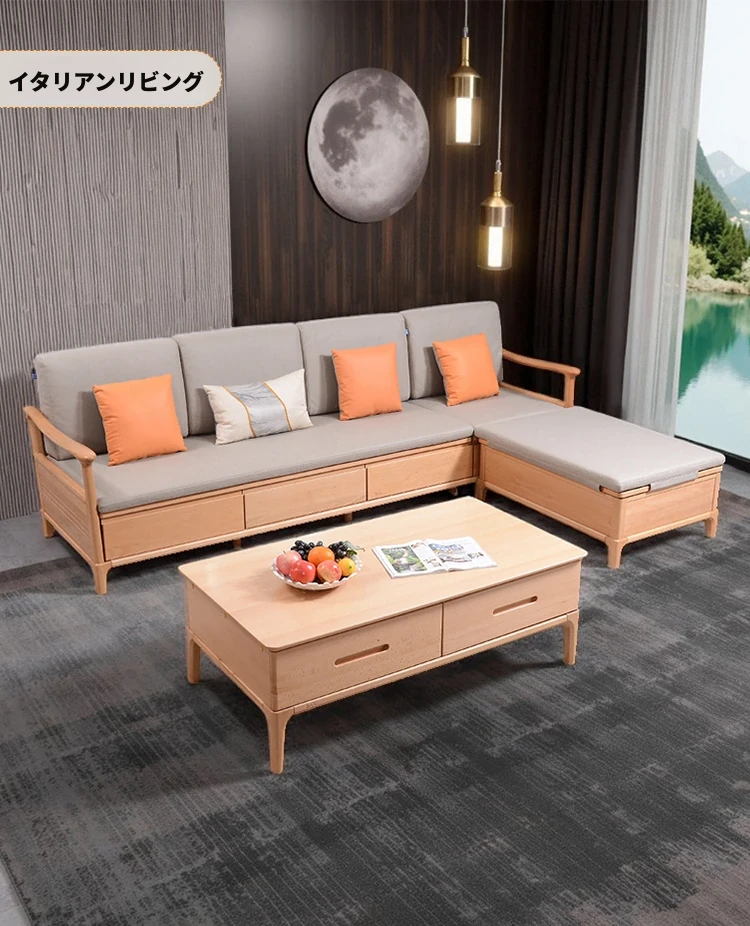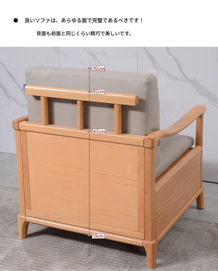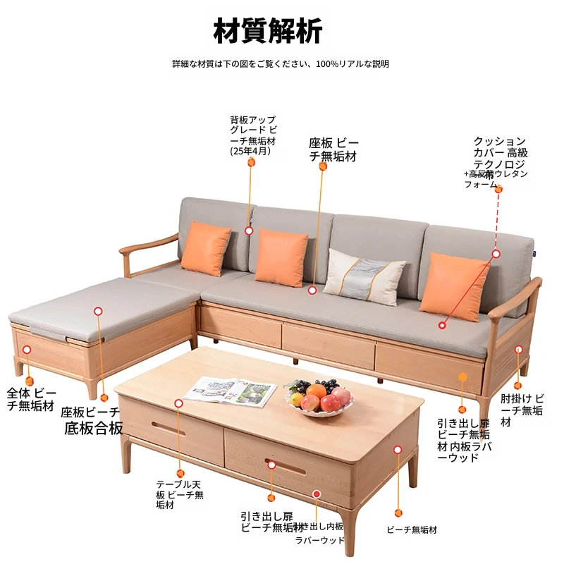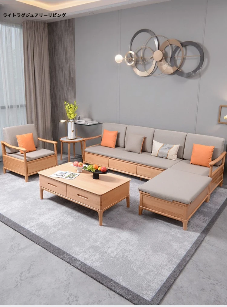 尚木 全実木ビーチウッドソファ 引き出し収納付き 新中式デザイン リビングルームに最適なナチュラルファブリックソファ