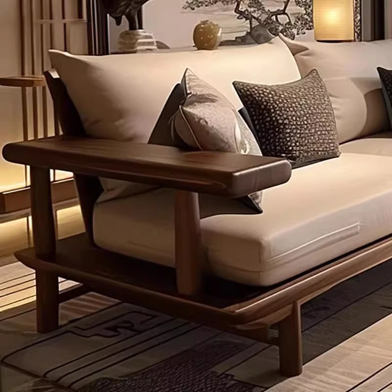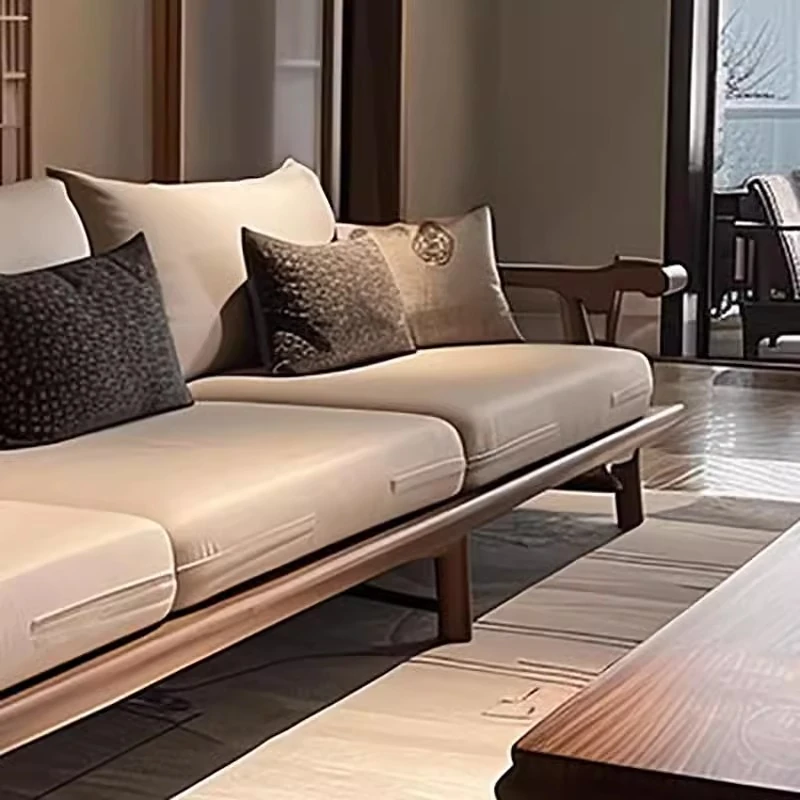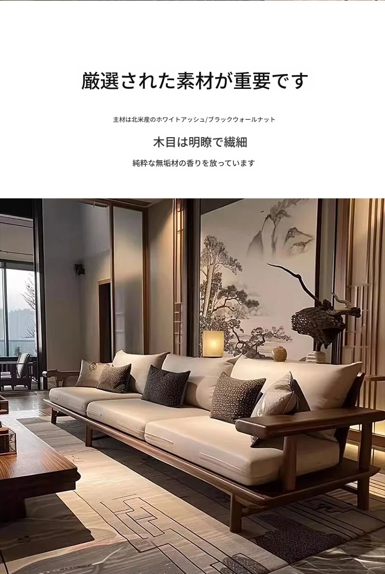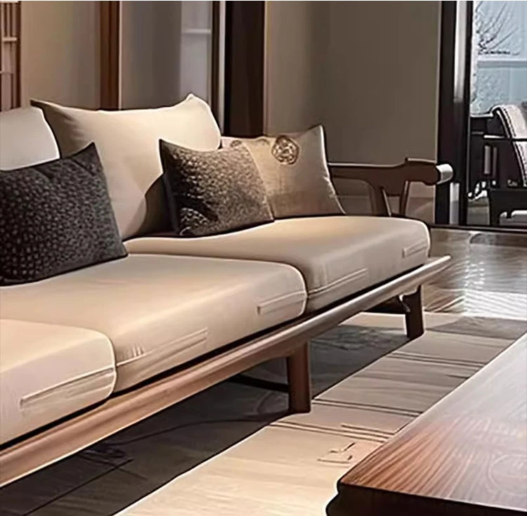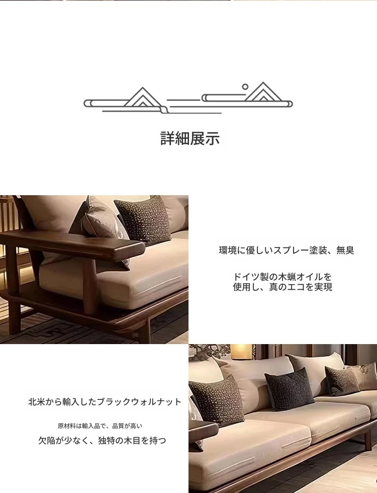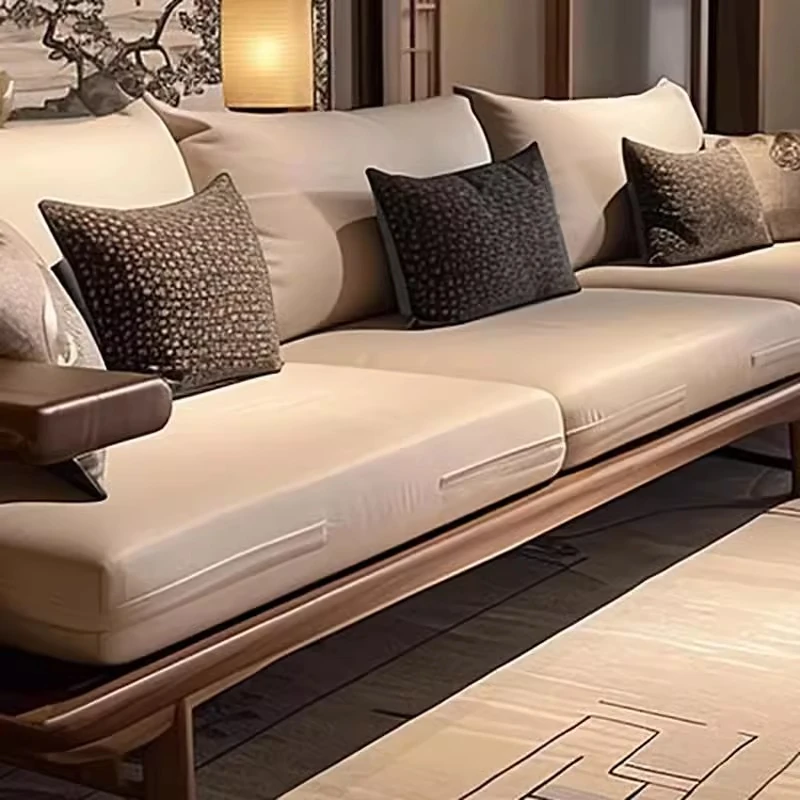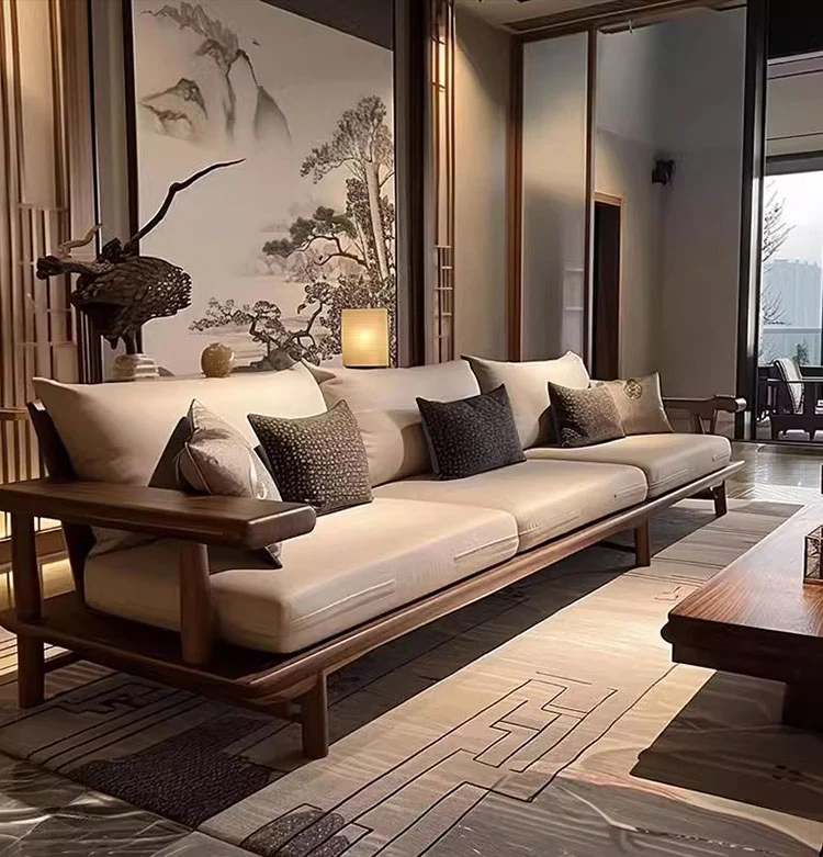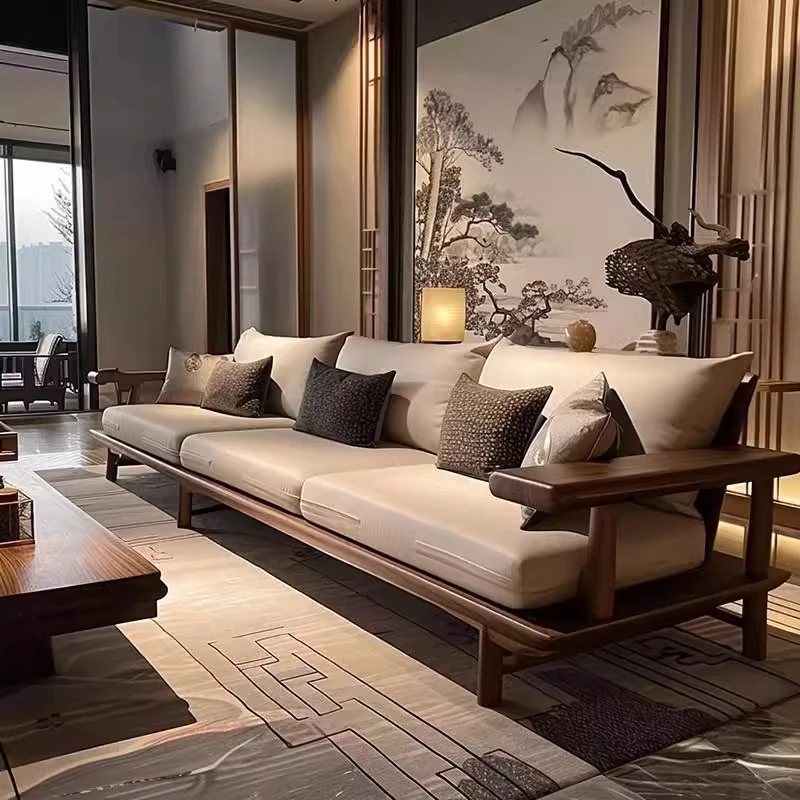 宋式美学のブラックウォールナット製の直線デザインソファとテーブル - 侘寂風の新中式、本格的なレザーソファ。民宿やホテルのリビングに最適な洗練されたスタイル。