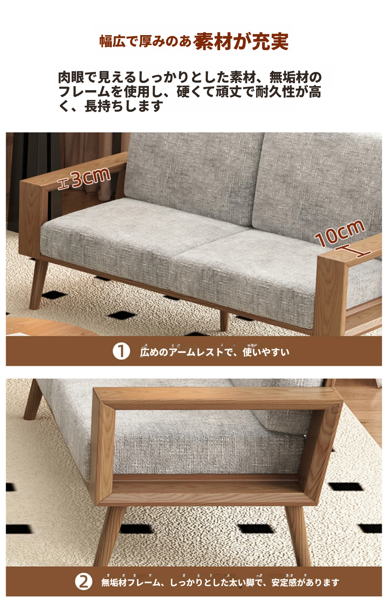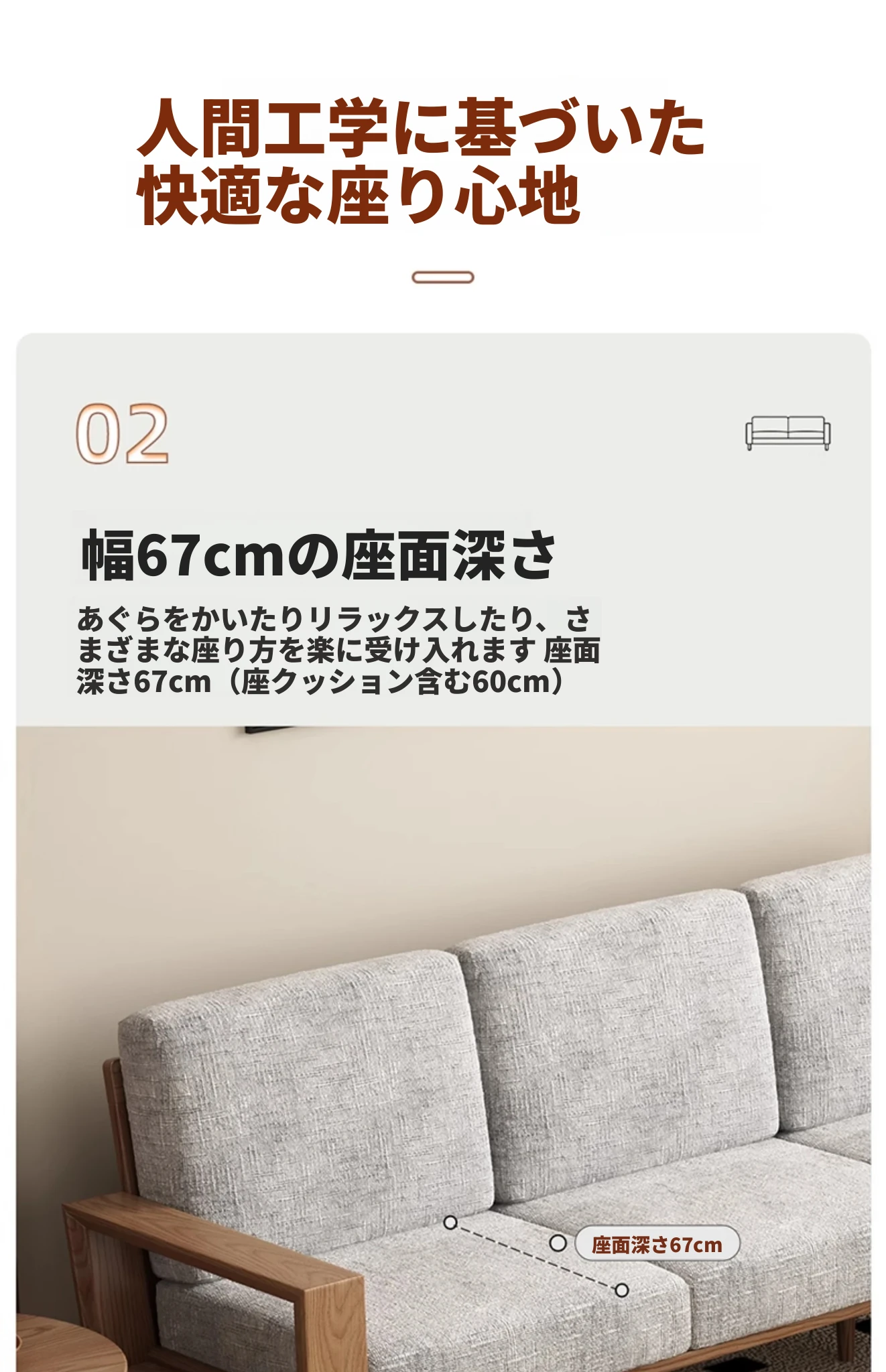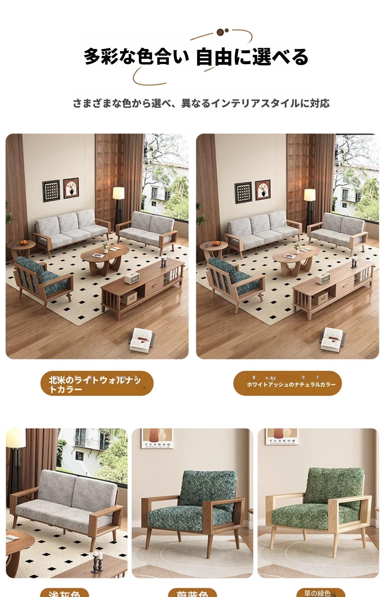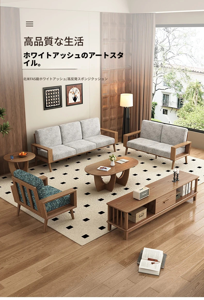 全実木製ソファ三人用ホワイトアッシュ材質 シンプルなリビング用1+2+3デザイン 厚手クッション付き 2025年新作登場!快適さとスタイルを兼ね備えた理想の空間を演出します。