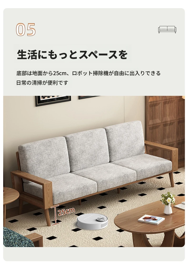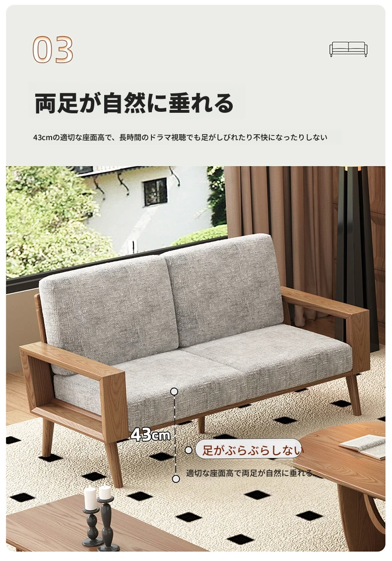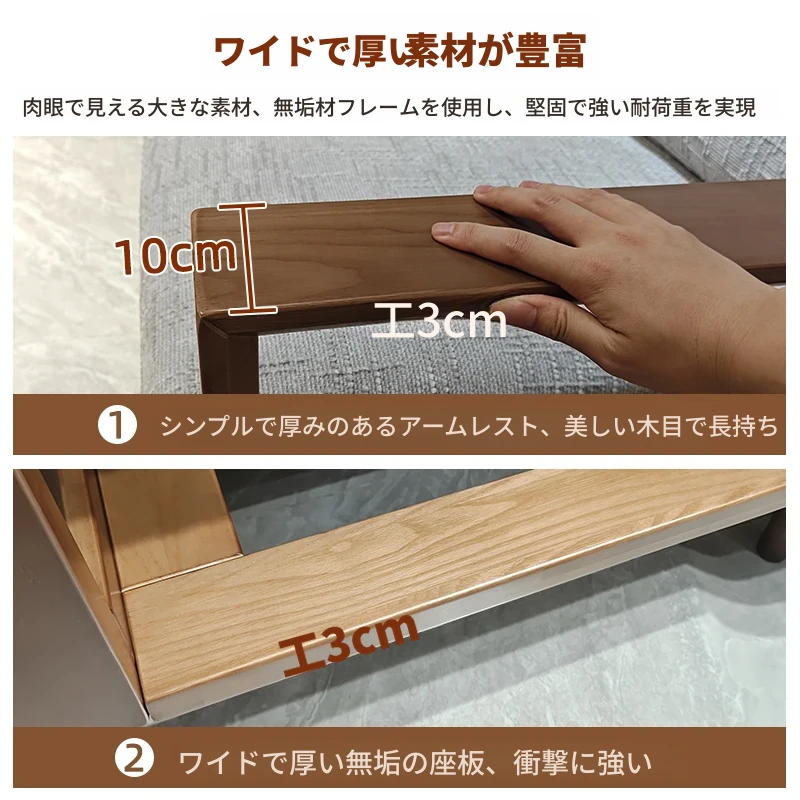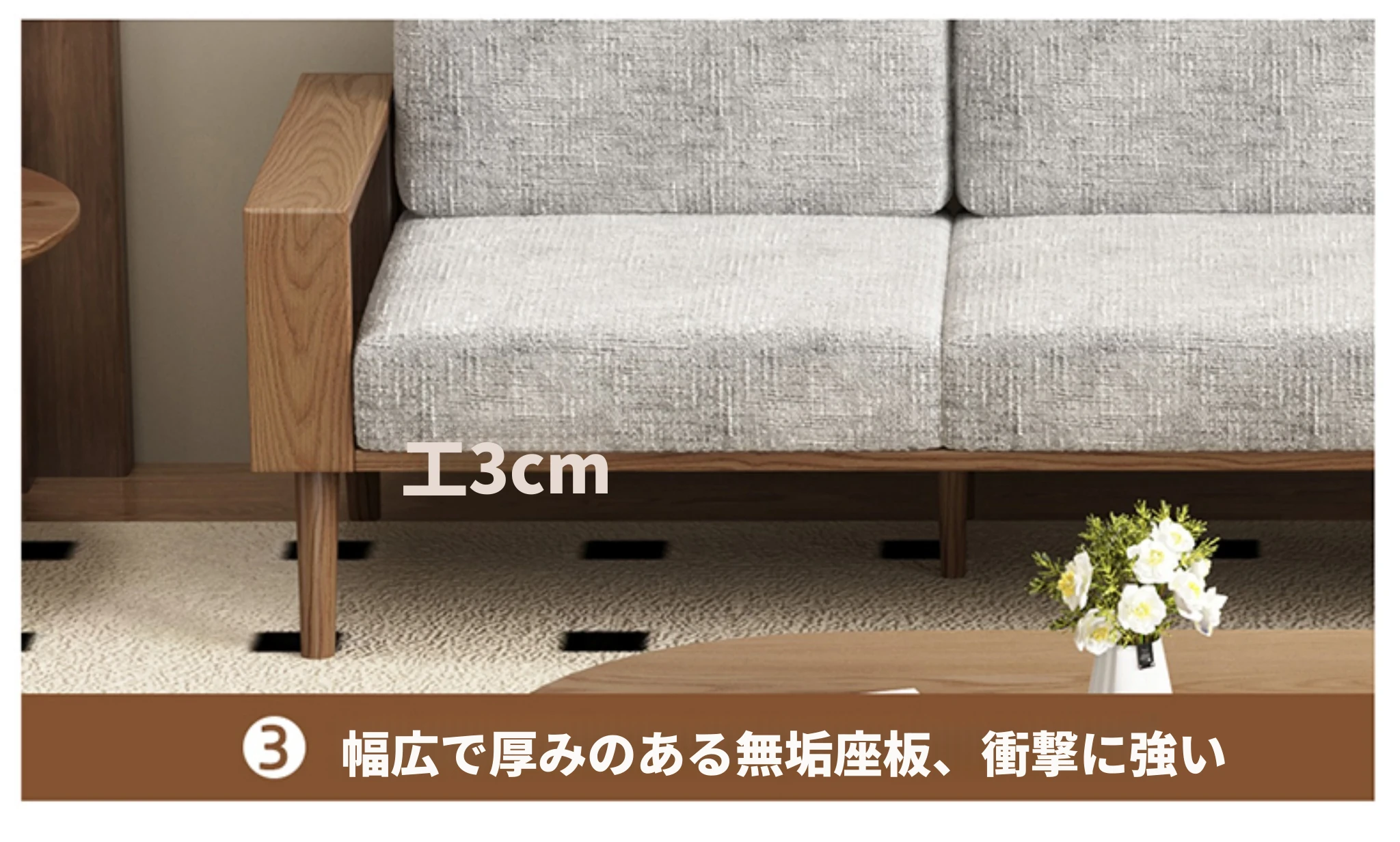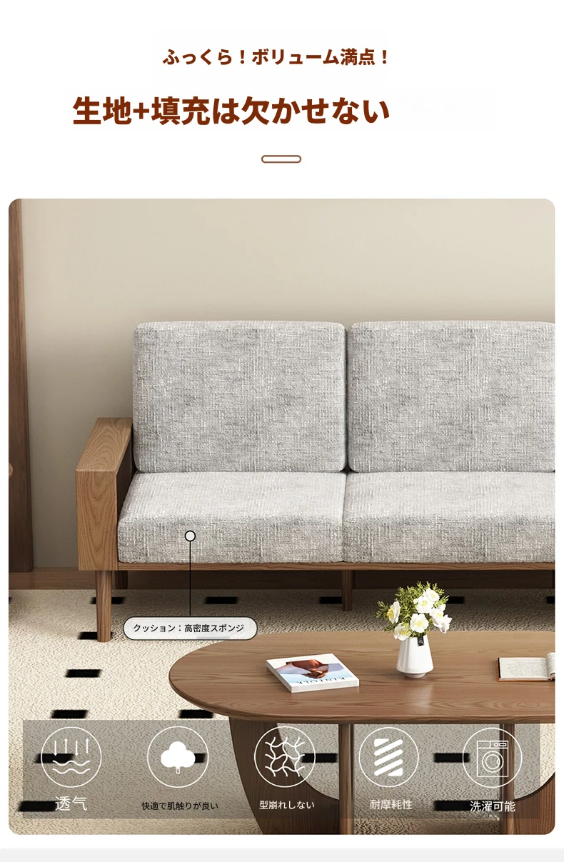 全実木製ソファ三人用ホワイトアッシュ材質 シンプルなリビング用1+2+3デザイン 厚手クッション付き 2025年新作登場!快適さとスタイルを兼ね備えた理想の空間を演出します。