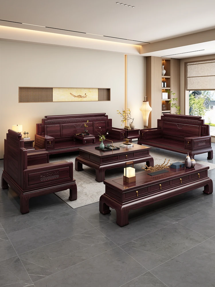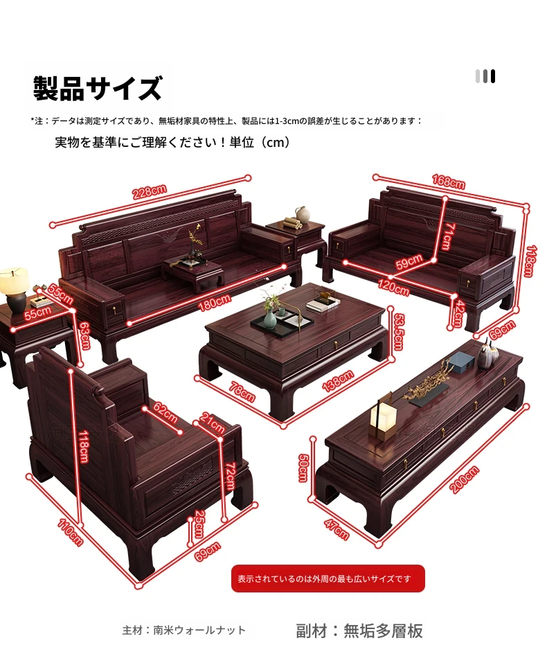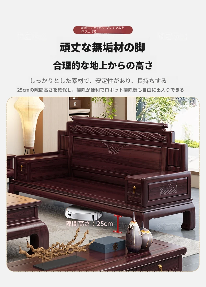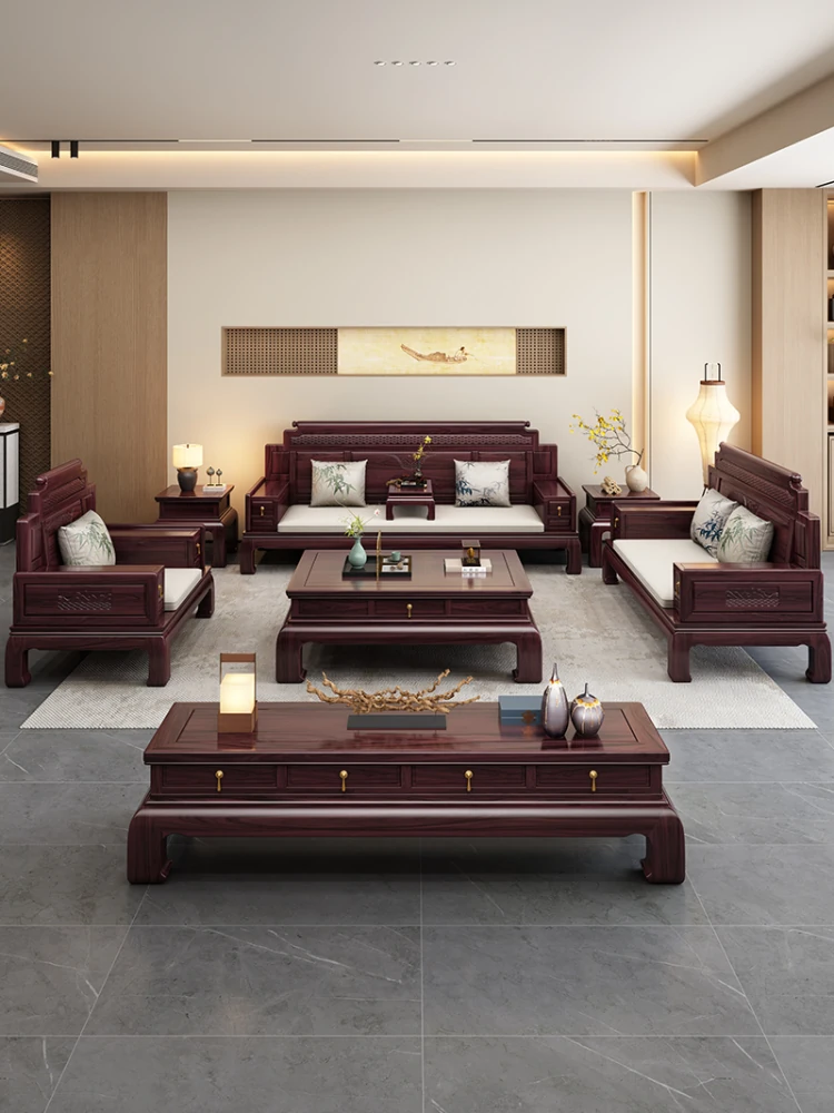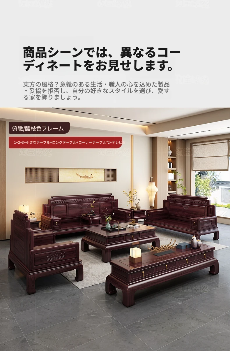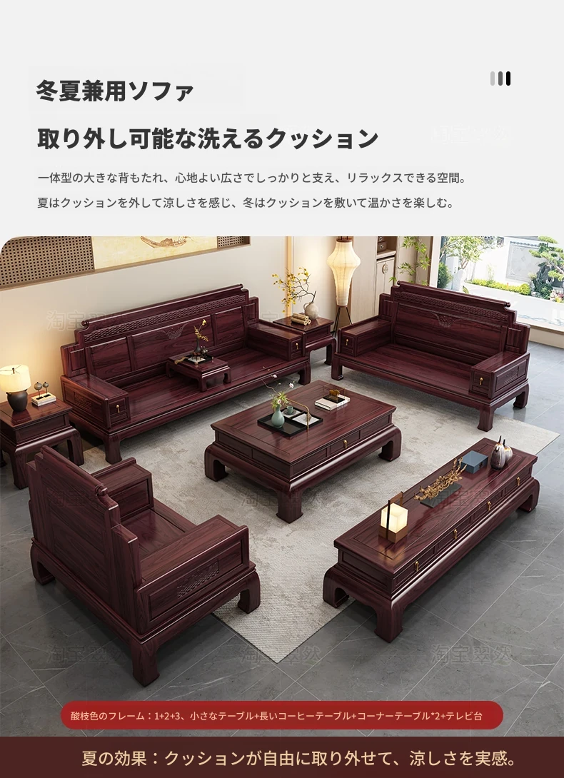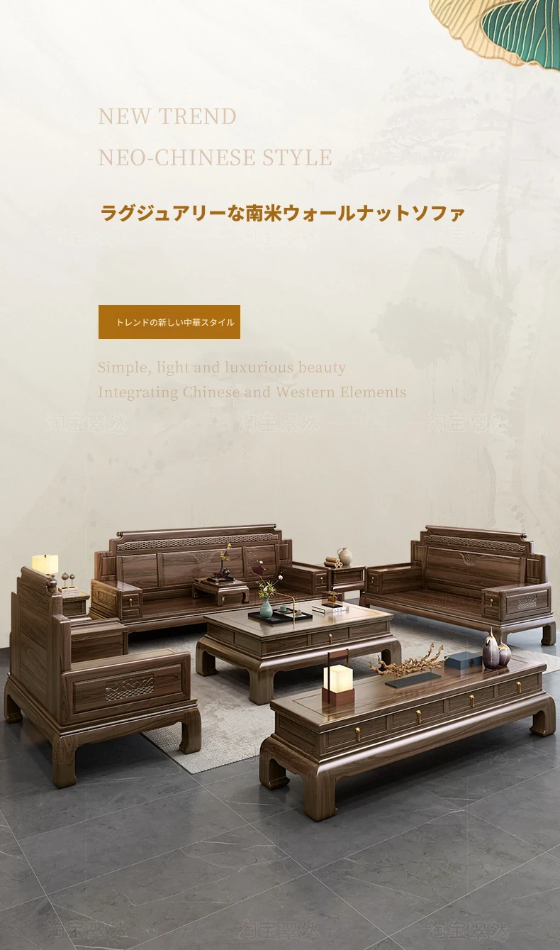 南米産ウォールナットの新中式スタイル!実木製ソファ123コンビネーション、リビングルームに最適な冬夏両用のアンティーク風大サイズ家具!高級感あふれるデザインで、居心地の良い空間を演出します。