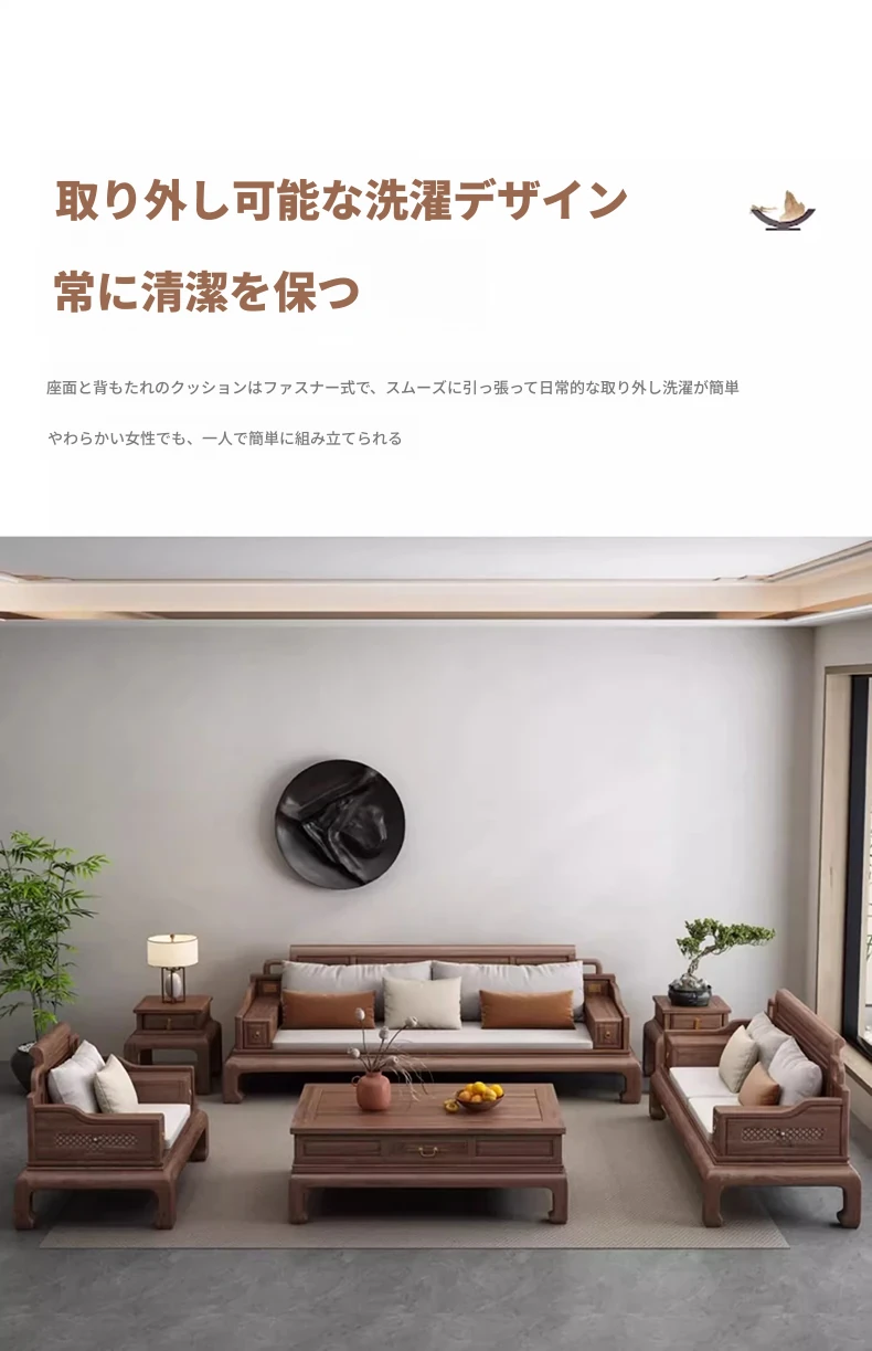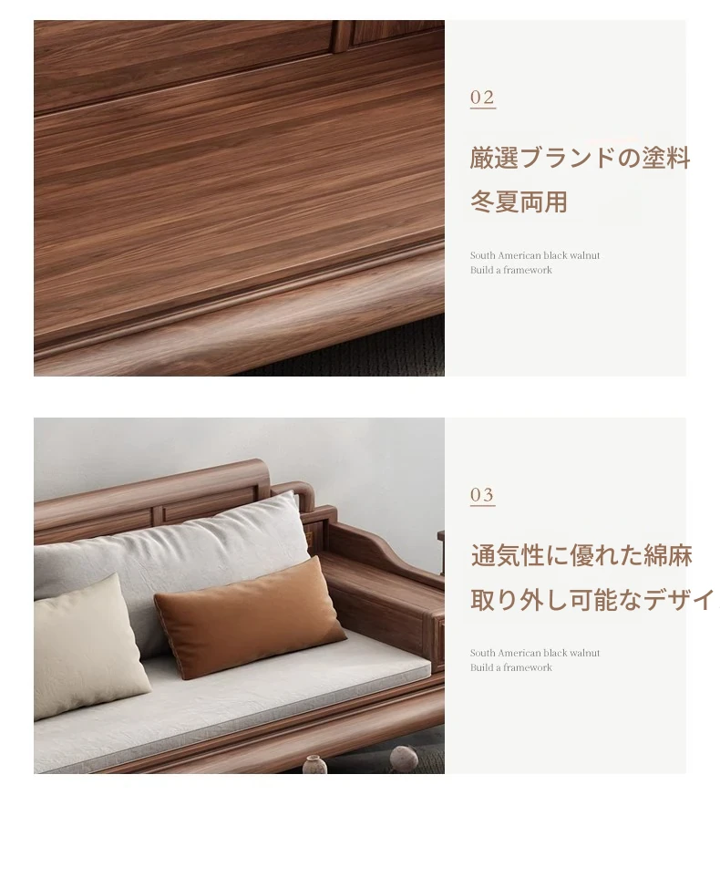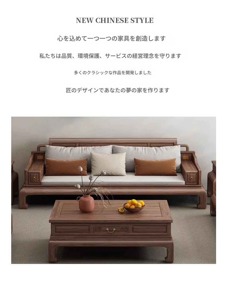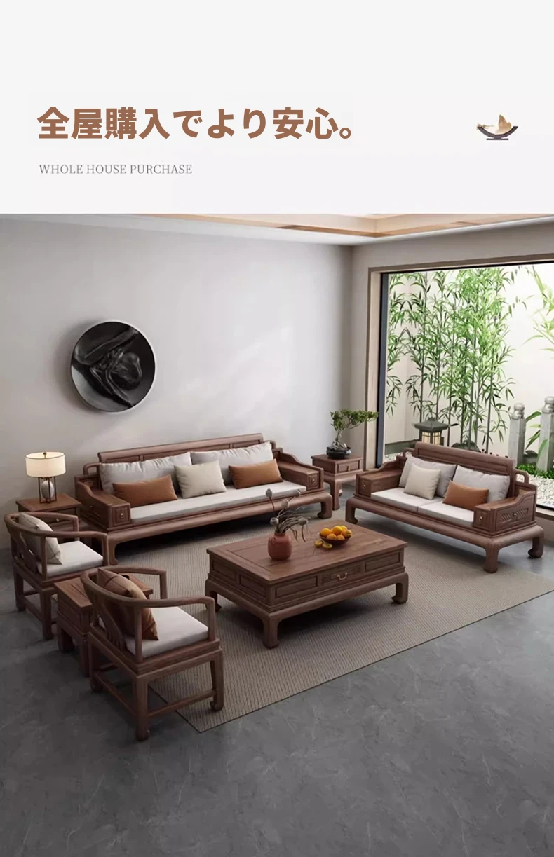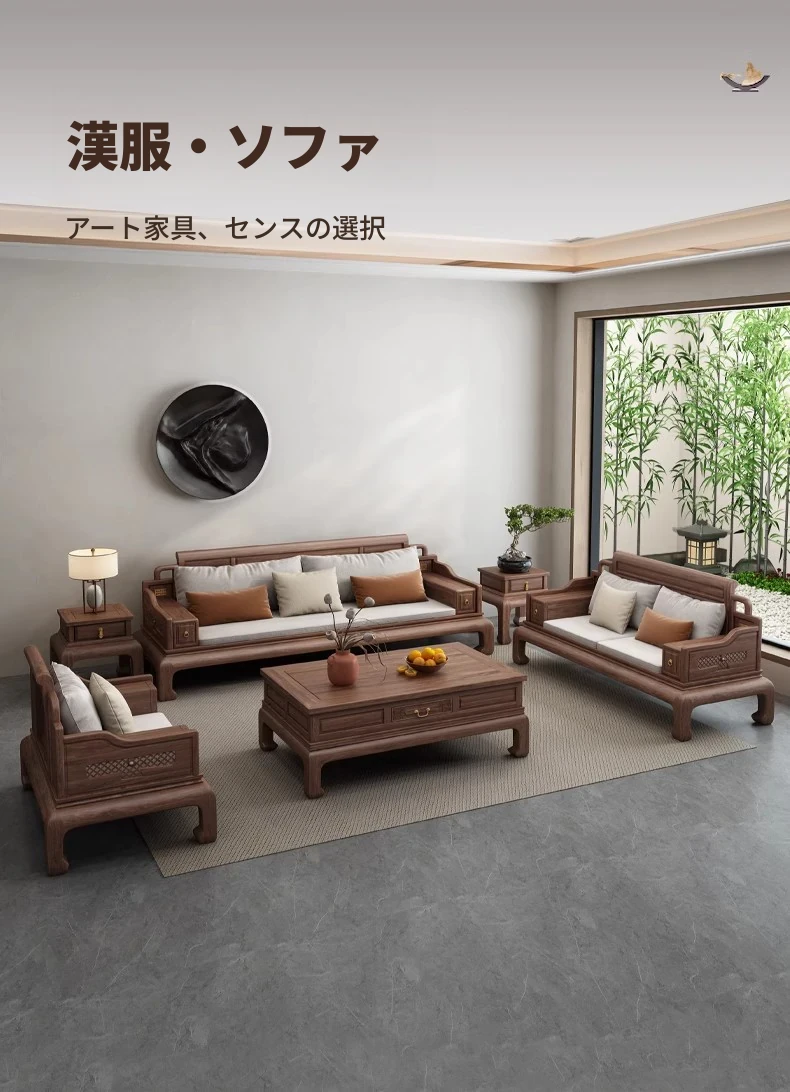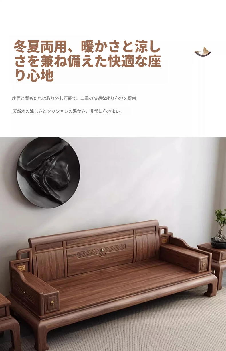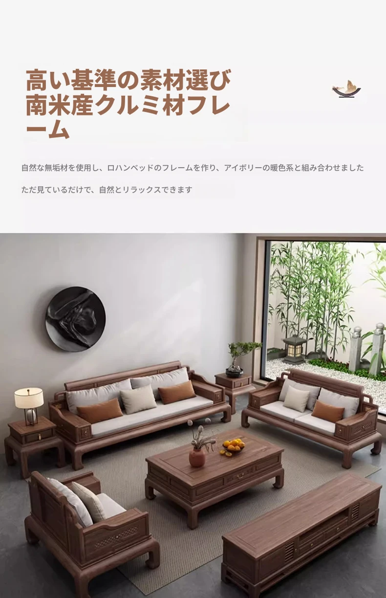 南米産ウォールナットの新中式無垢材ソファセット - 大型リビングルームに最適!冬も夏も快適に使える国潮風のアンティークスタイル家具。おしゃれで機能的な空間を演出します。