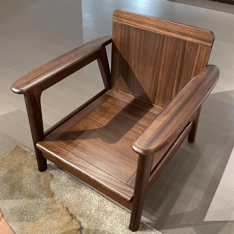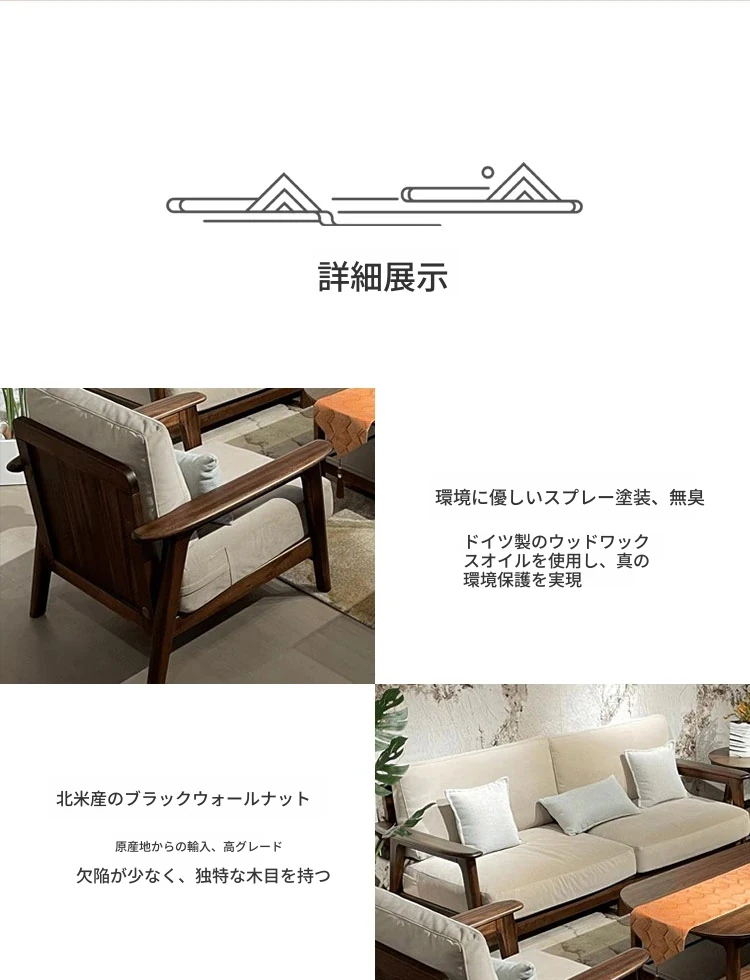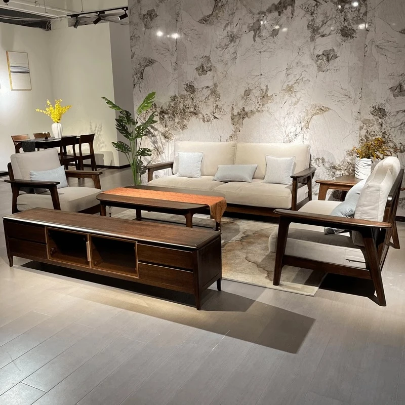 新中式禅の黒胡桃木製直置きソファ&テーブルセット - 侘寂の美学を感じる、宿泊施設やホテルのリビングにぴったりなコットン&リネンソファ!心を落ち着ける空間を演出します。